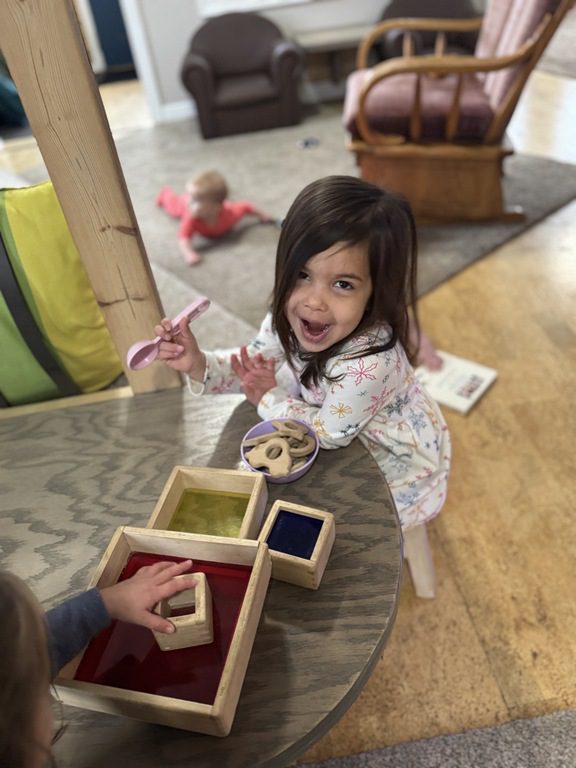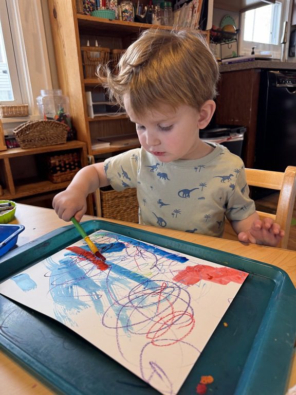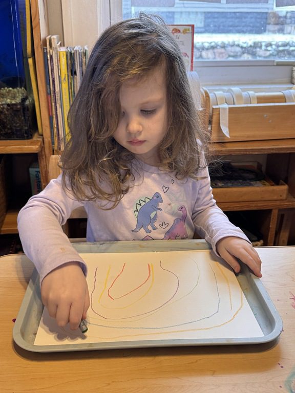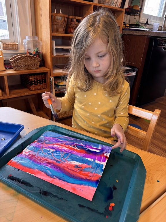 This morning, we offered an art activity involving a mixed media technique. Some of our kids have been interested in mixed media and we have talked a few times about what that means. Today, we tried making drawings with oil pastels and then used water color to paint over the top of our drawings. We observed the way the oil resisted the watercolor creating interesting effects.