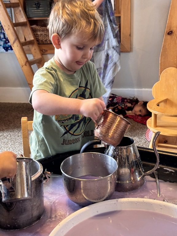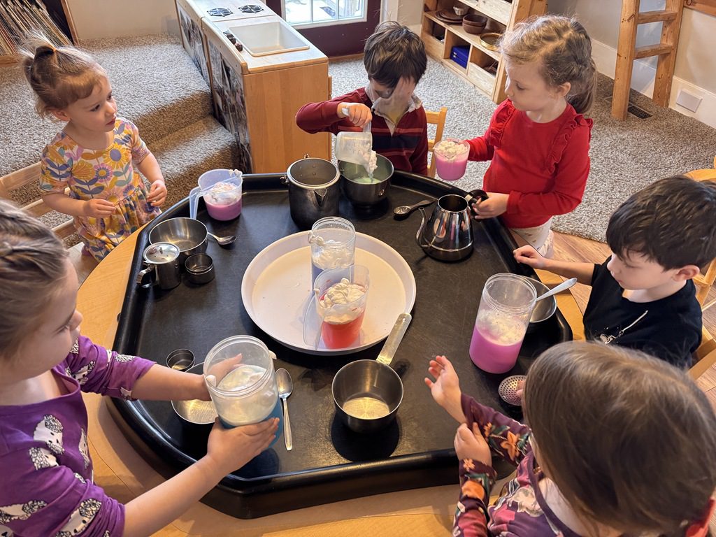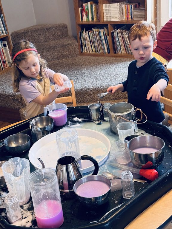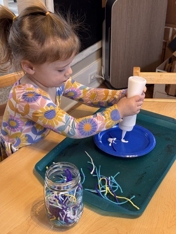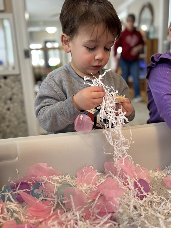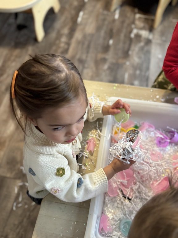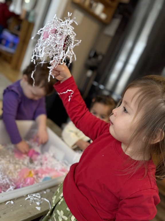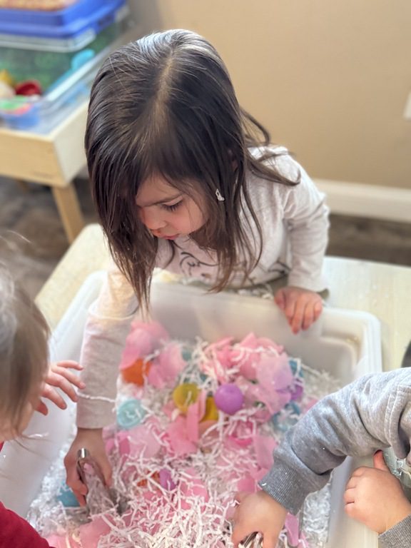 This morning we created a new sensory table experience. We added shredded white paper with glitter pieces, pink fabric flower petals, plastic eggs, small animals and tongs. The friends enjoyed finding the animals hidden in the shredded paper and picking up the shredded paper with their tongs.