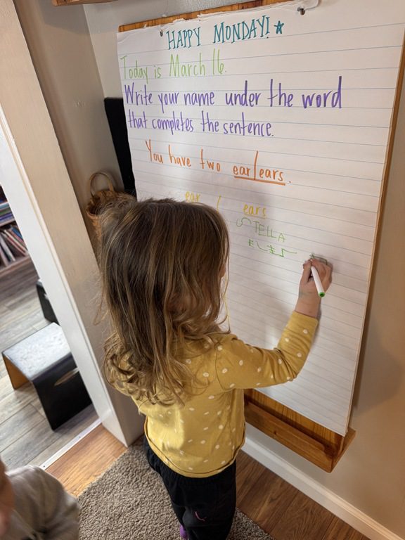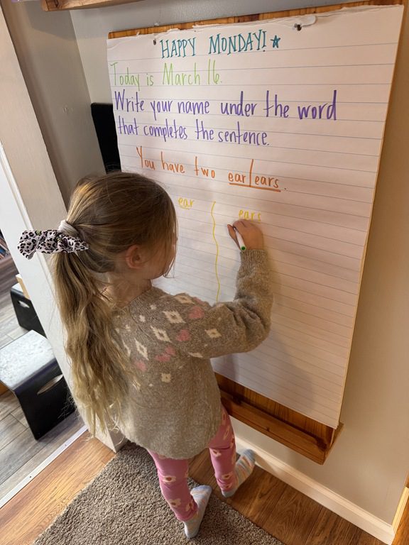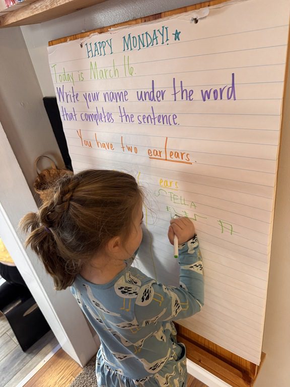 We kicked off the week by starting to talk about singular and plural nouns in our PREK1 sign in. We read a sentence together and using context clues, children determined which noun completed the sentence. As we read the sentence, we inserted both nouns into the sentence to see which one made sense.