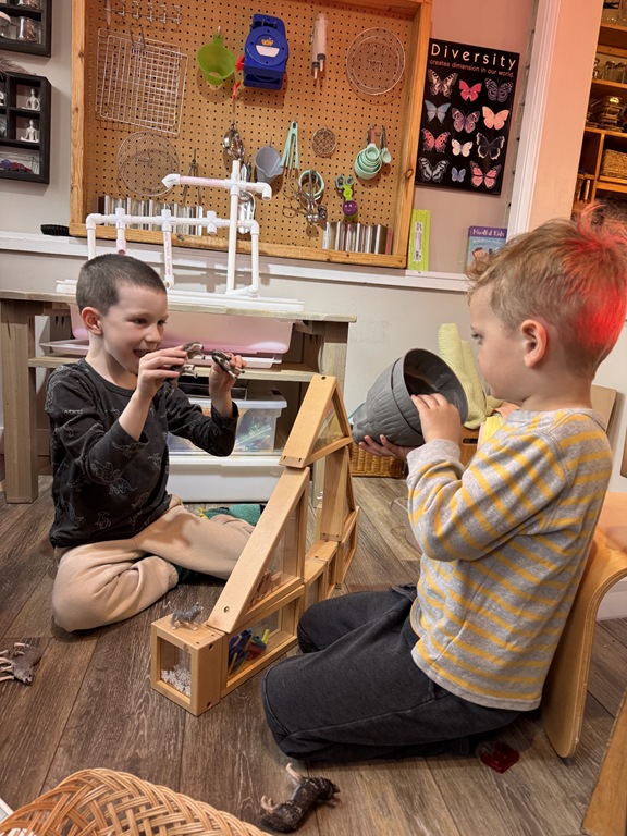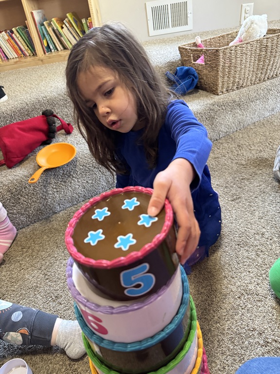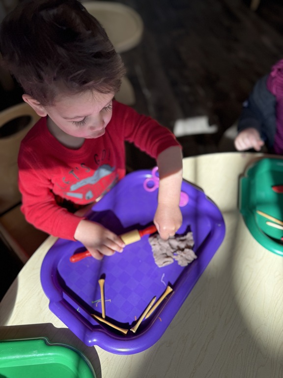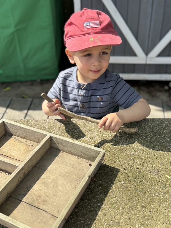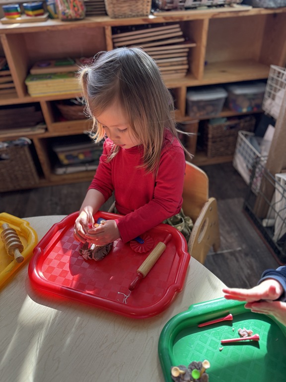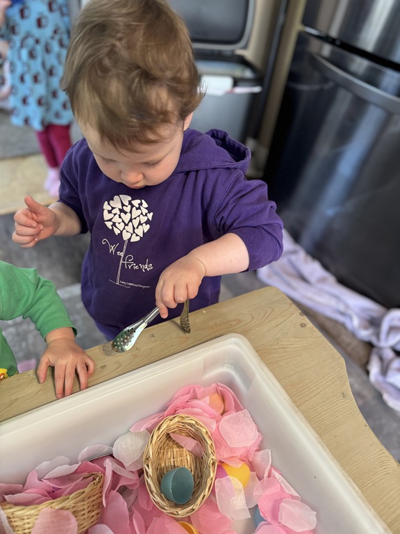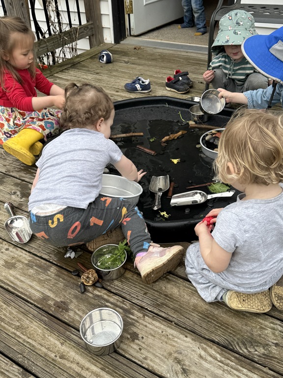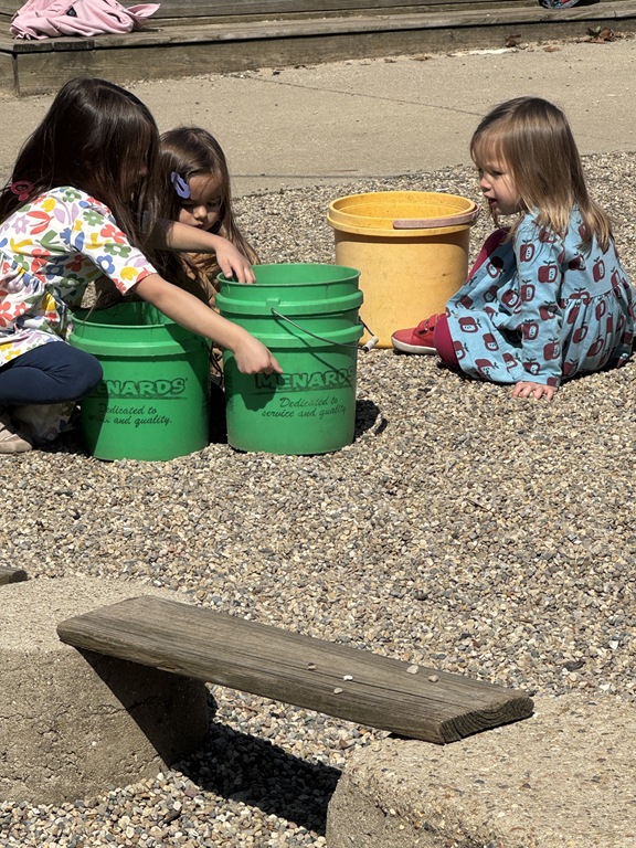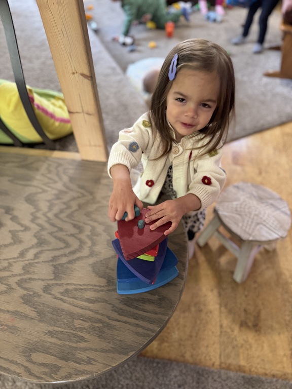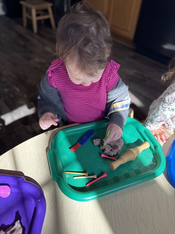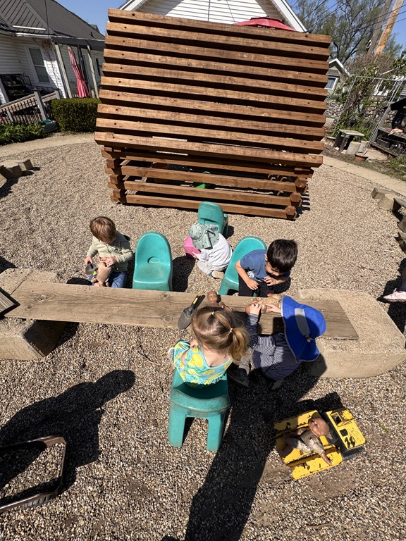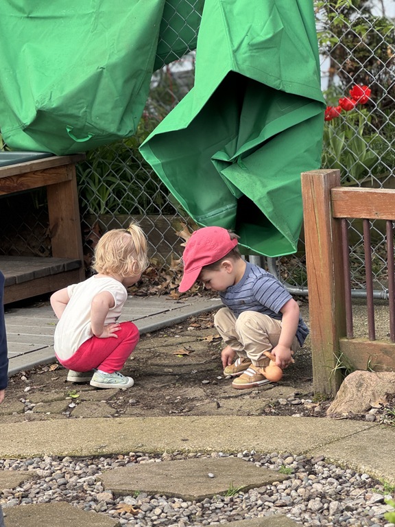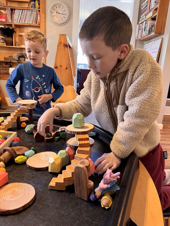We added some loose parts building materials to the tuff tray this morning to continue exploring various ways to build. A couple of friends spent all morning building a “tooth fairy castle”. They practiced balancing objects and learning about how different sizes shapes and weights behave in space. This kind of play is how kids begin to explore applied physics. So much is happening in what seems like simple play.
