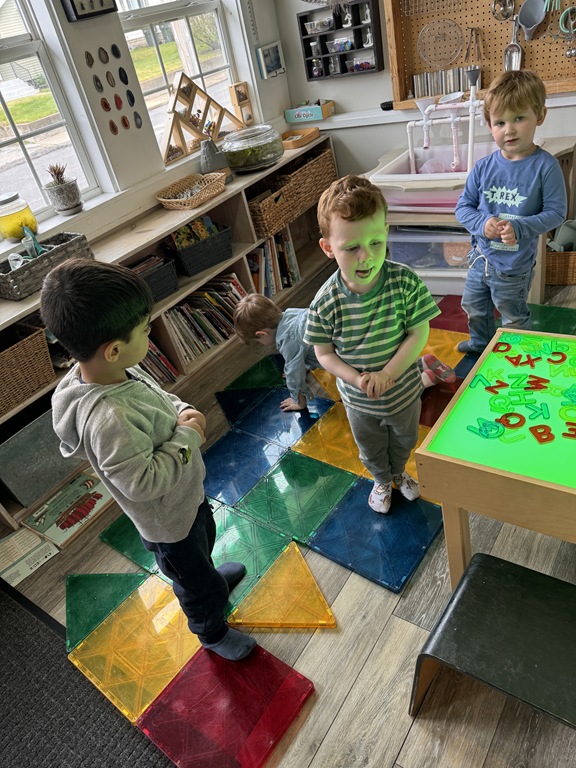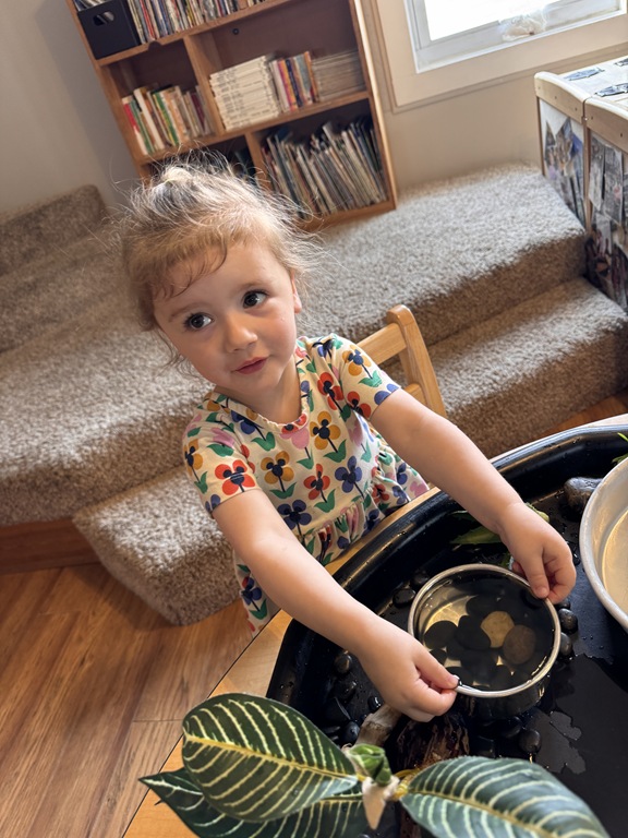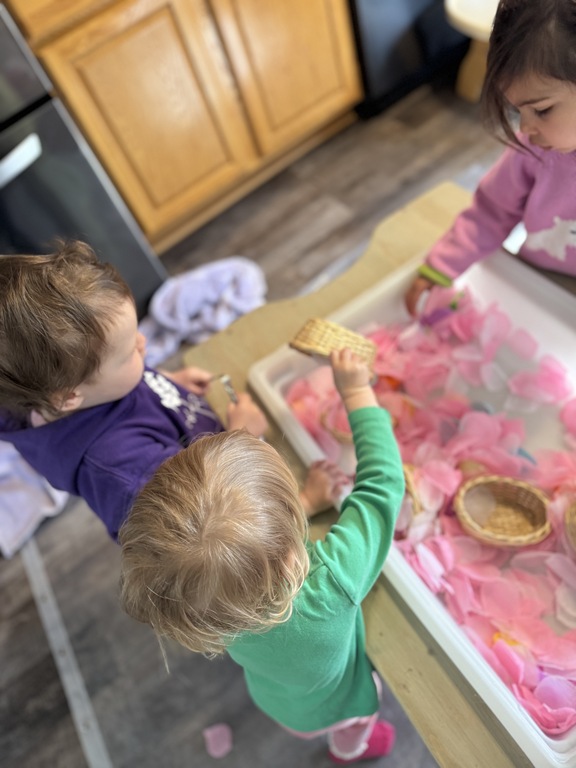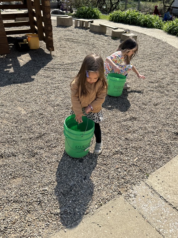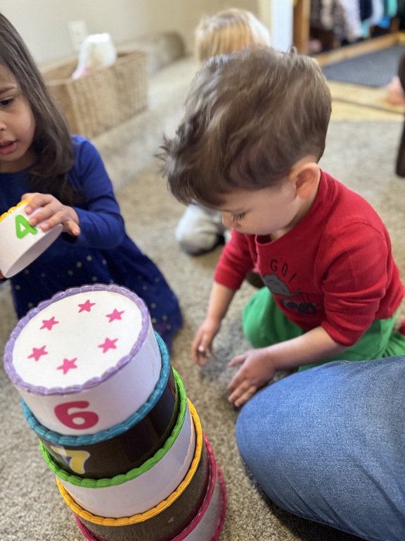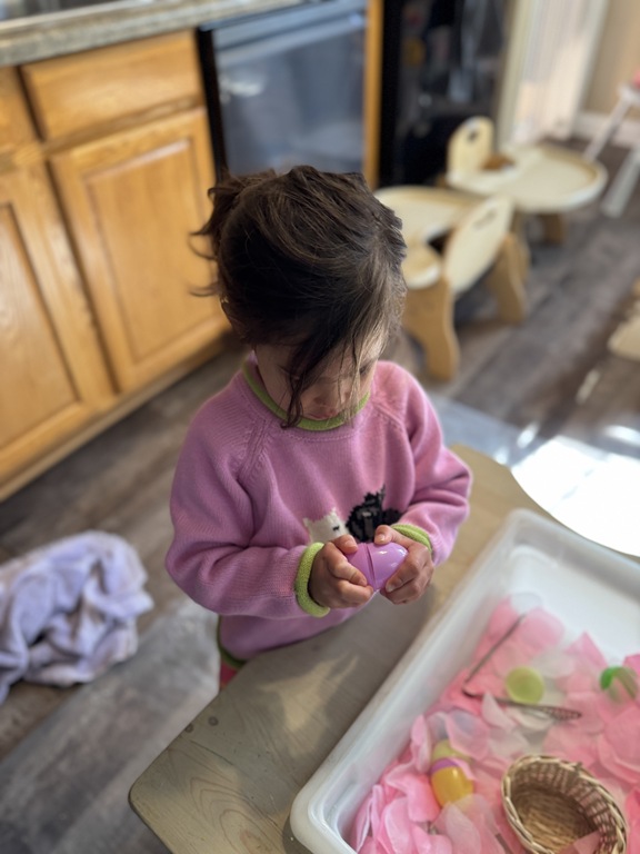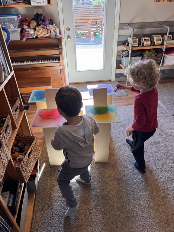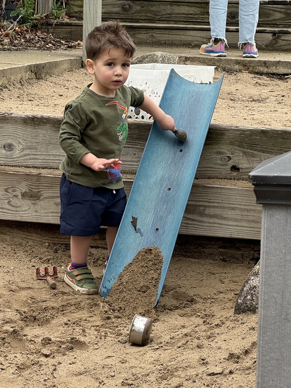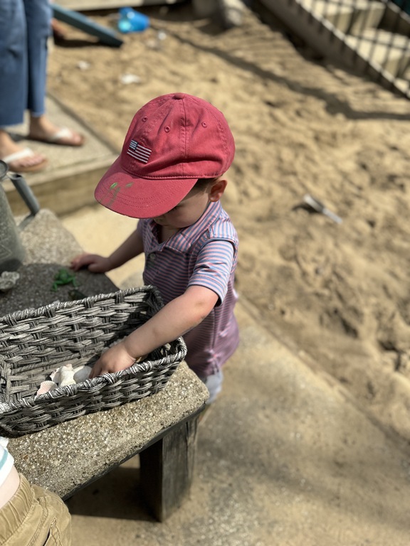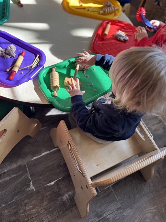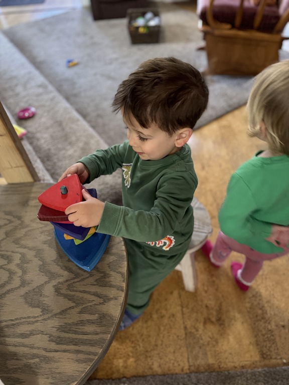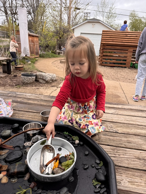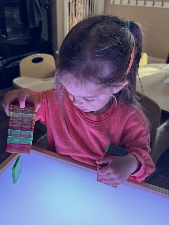We added some loose parts building materials to the tuff tray this morning to continue exploring various ways to build. A couple of friends spent all morning building a “tooth fairy castle”. They practiced balancing objects and learning about how different sizes shapes and weights behave in space. This kind of play is how kids begin to explore applied physics. So much is happening in what seems like simple play.