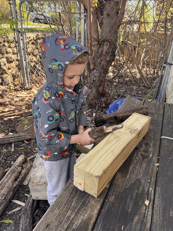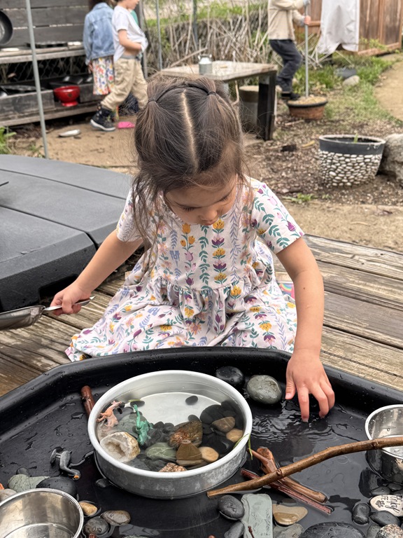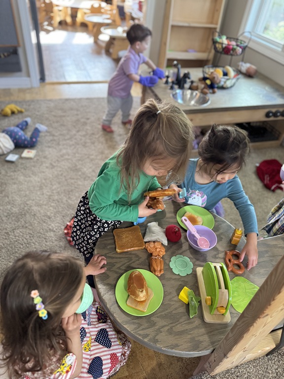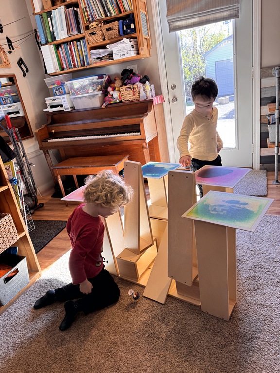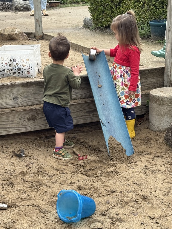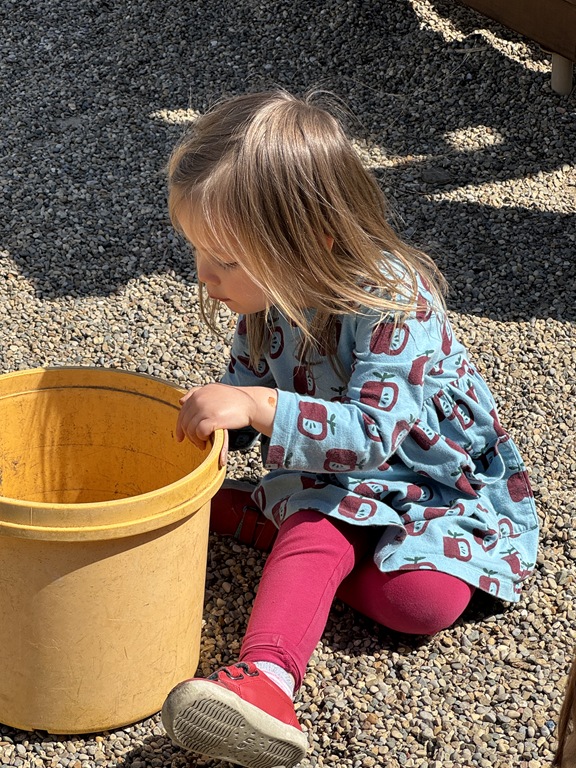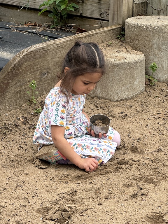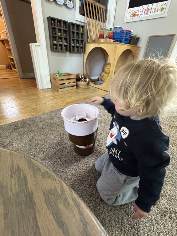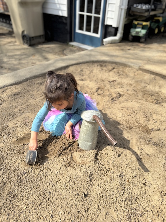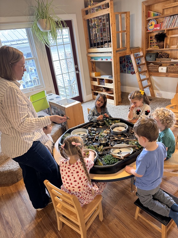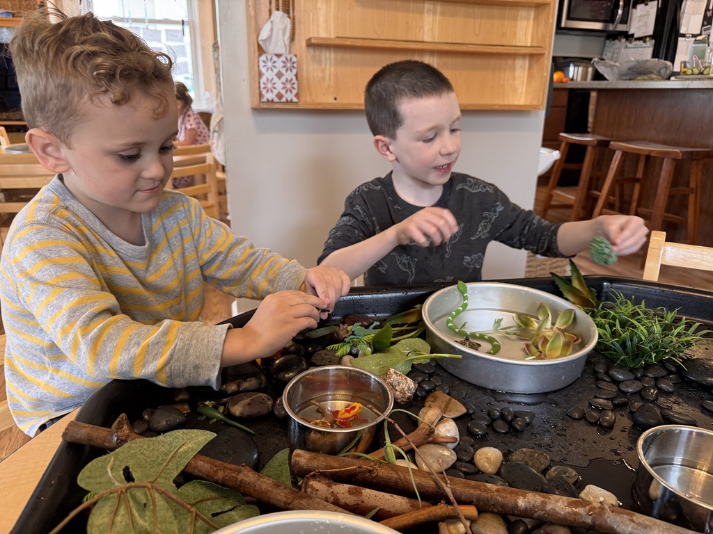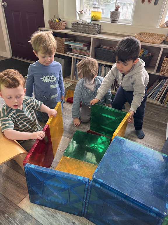 We added some loose parts building materials to the tuff tray this morning to continue exploring various ways to build. A couple of friends spent all morning building a “tooth fairy castle”. They practiced balancing objects and learning about how different sizes shapes and weights behave in space. This kind of play is how kids begin to explore applied physics. So much is happening in what seems like simple play.