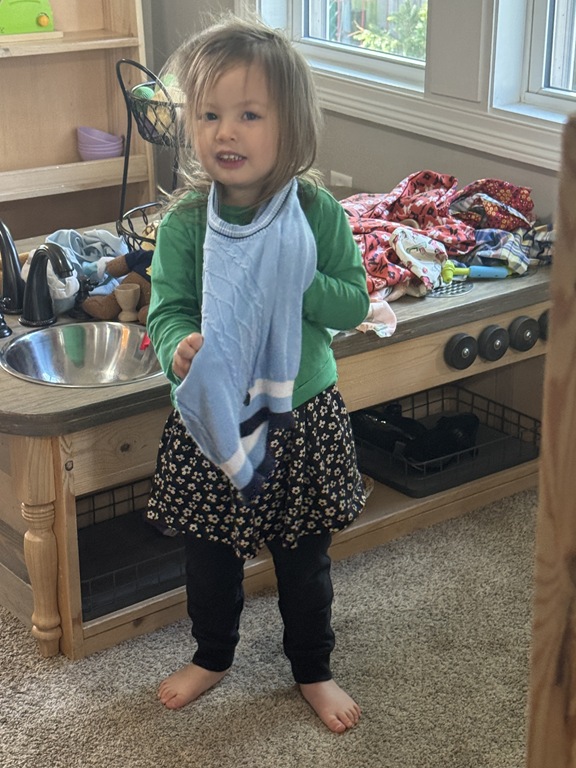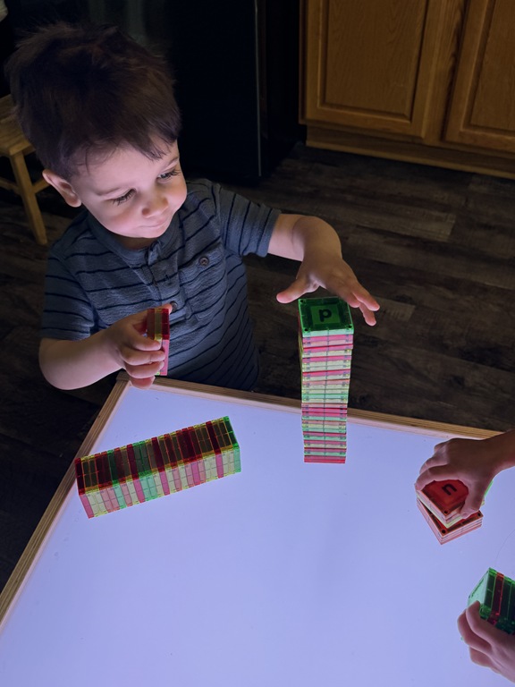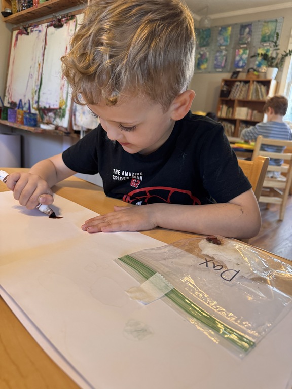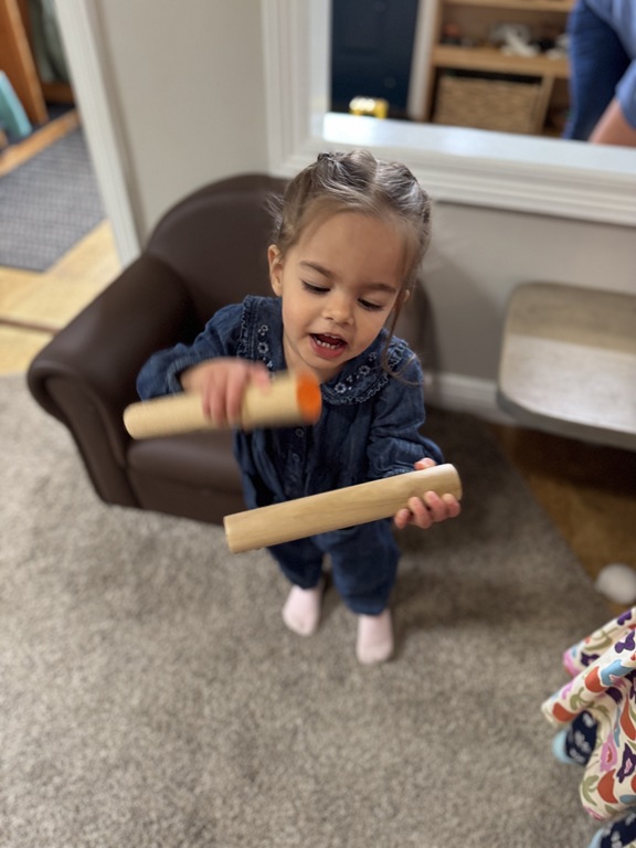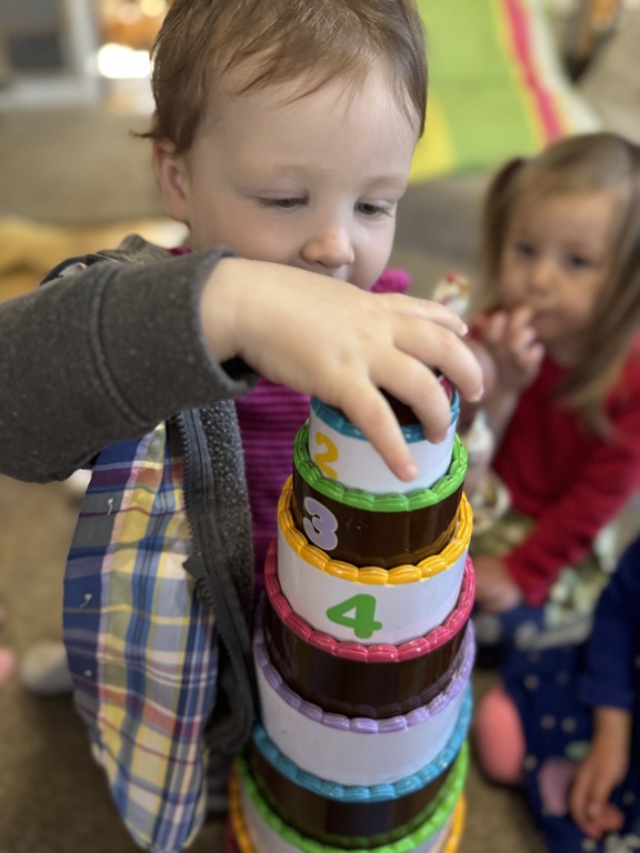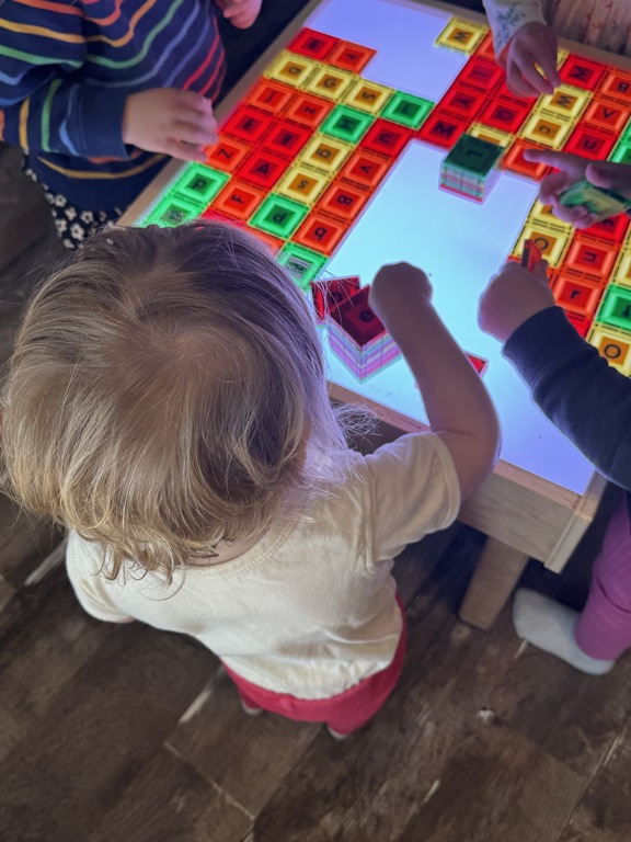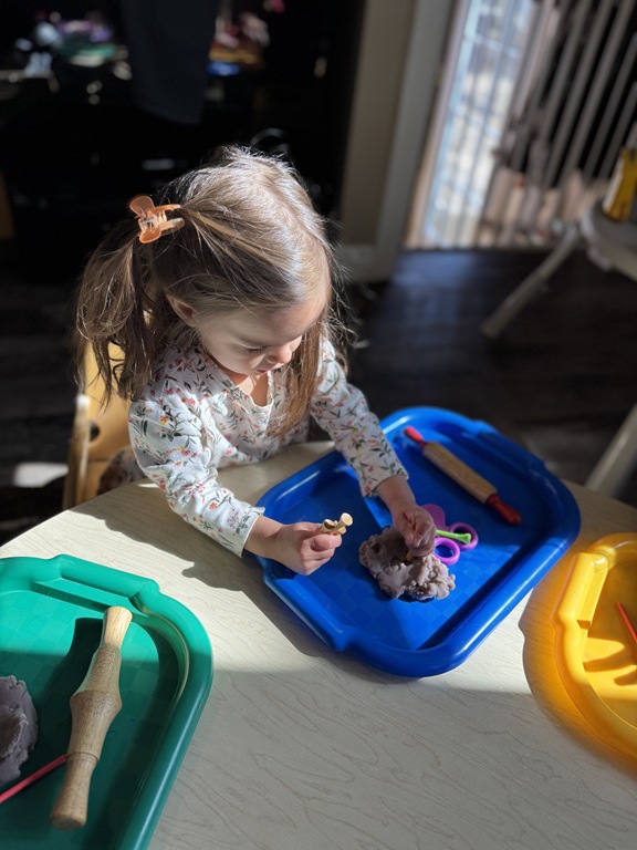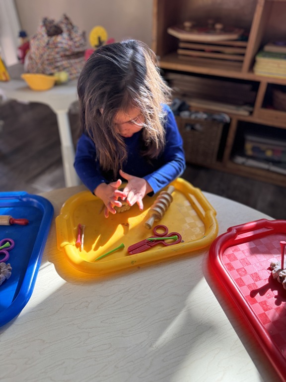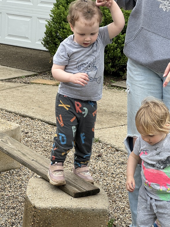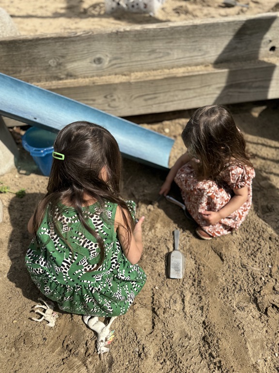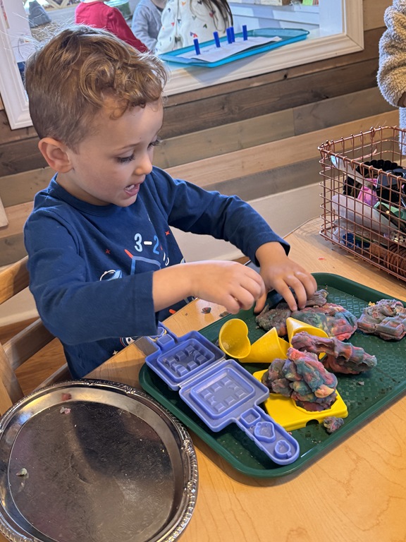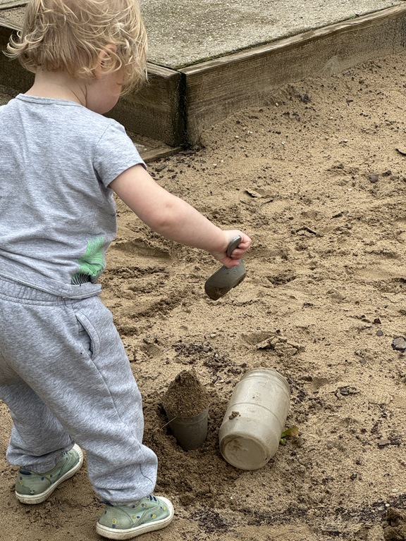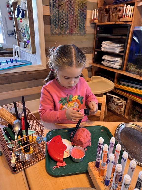 We added some loose parts building materials to the tuff tray this morning to continue exploring various ways to build. A couple of friends spent all morning building a “tooth fairy castle”. They practiced balancing objects and learning about how different sizes shapes and weights behave in space. This kind of play is how kids begin to explore applied physics. So much is happening in what seems like simple play.
