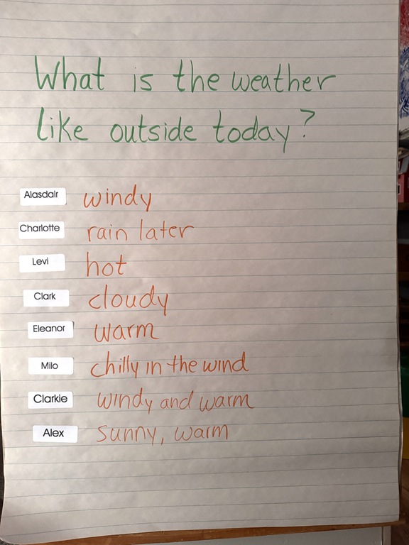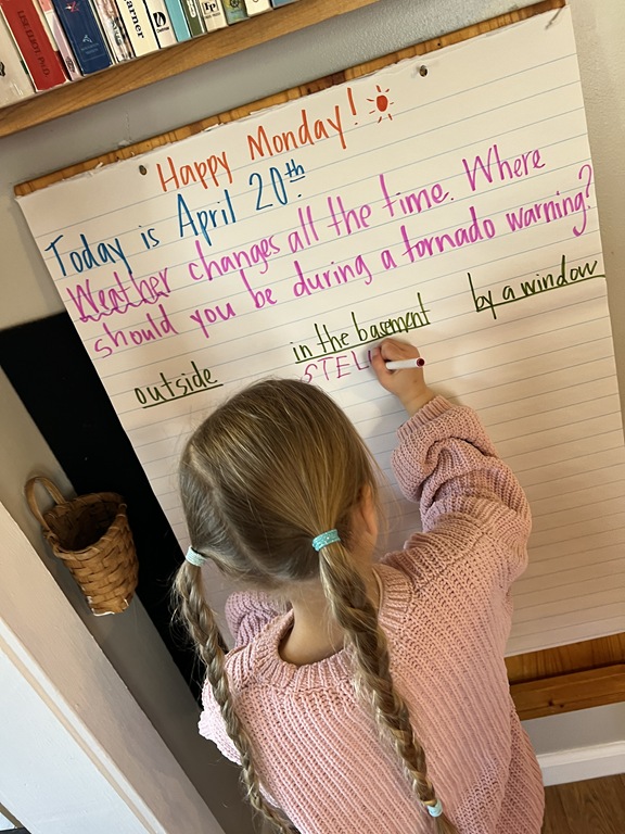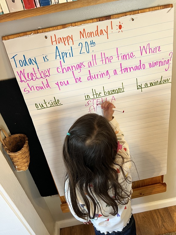On our FAB rotation this week is weather! For our PREK1 sign in, children talked about tornadoes since we had a tornado warning just a few nights ago! We talked about what we do in case of a tornado and where we should go! Friends quickly shared their “basement” stories from over the weekend. We discussed why we stay away from windows and why basements are the safest place during a tornado.