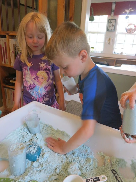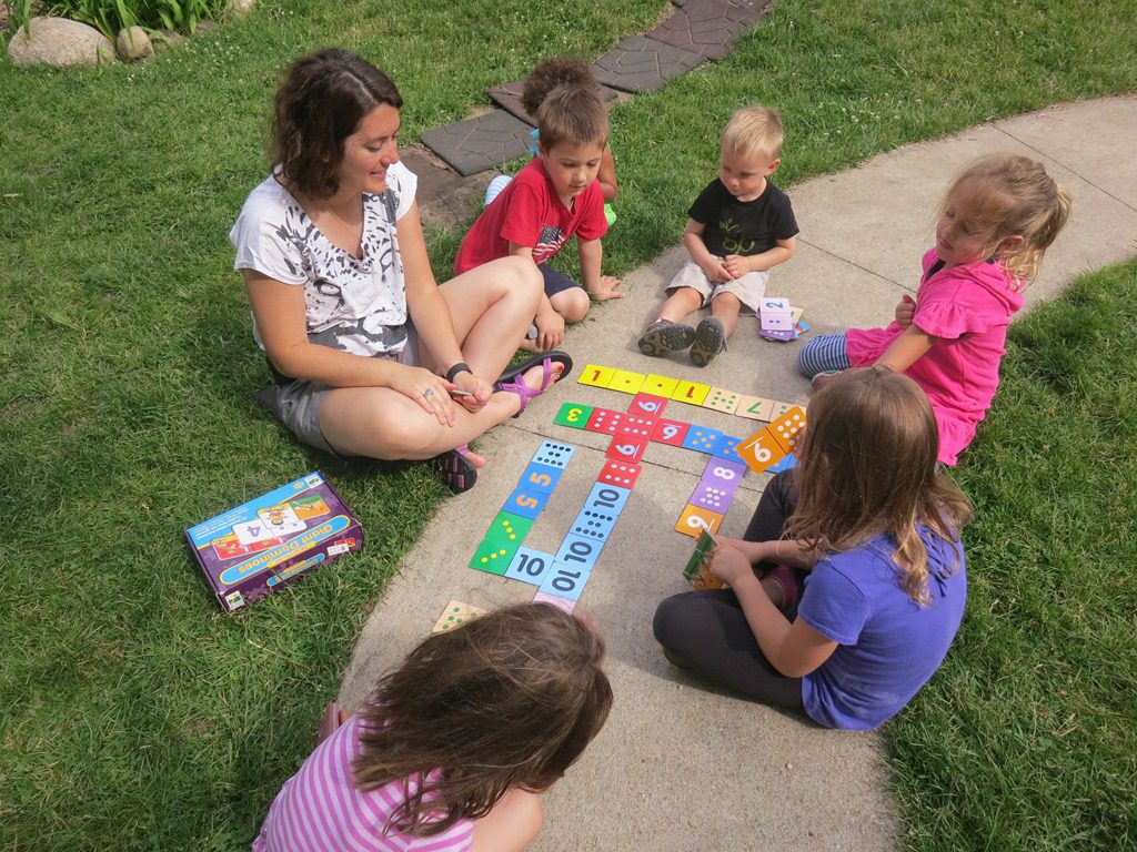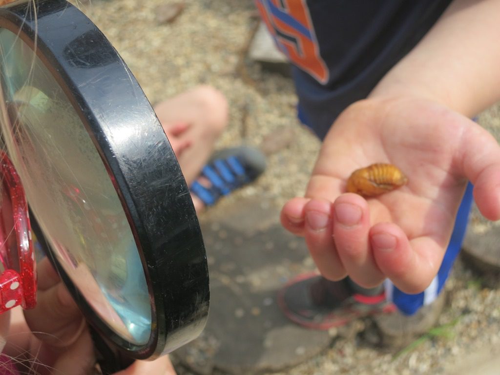 Playing giant dominos, creating with moon sand and looking at bugs.