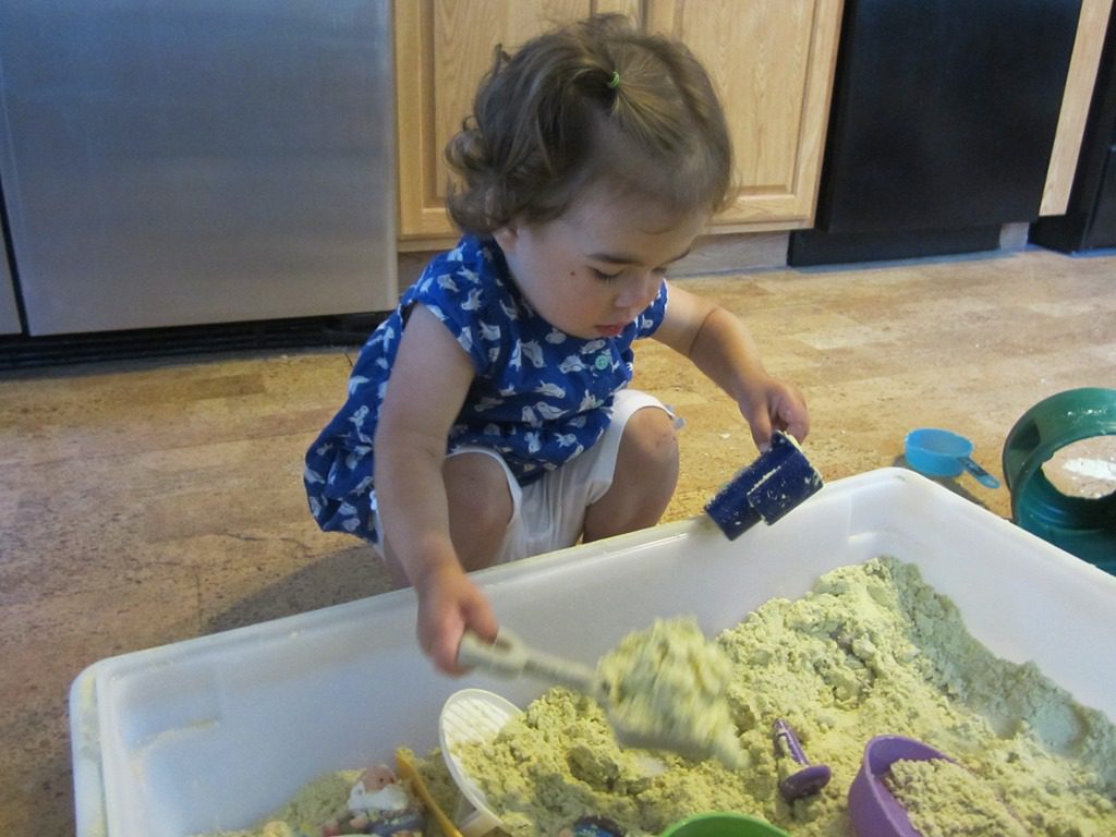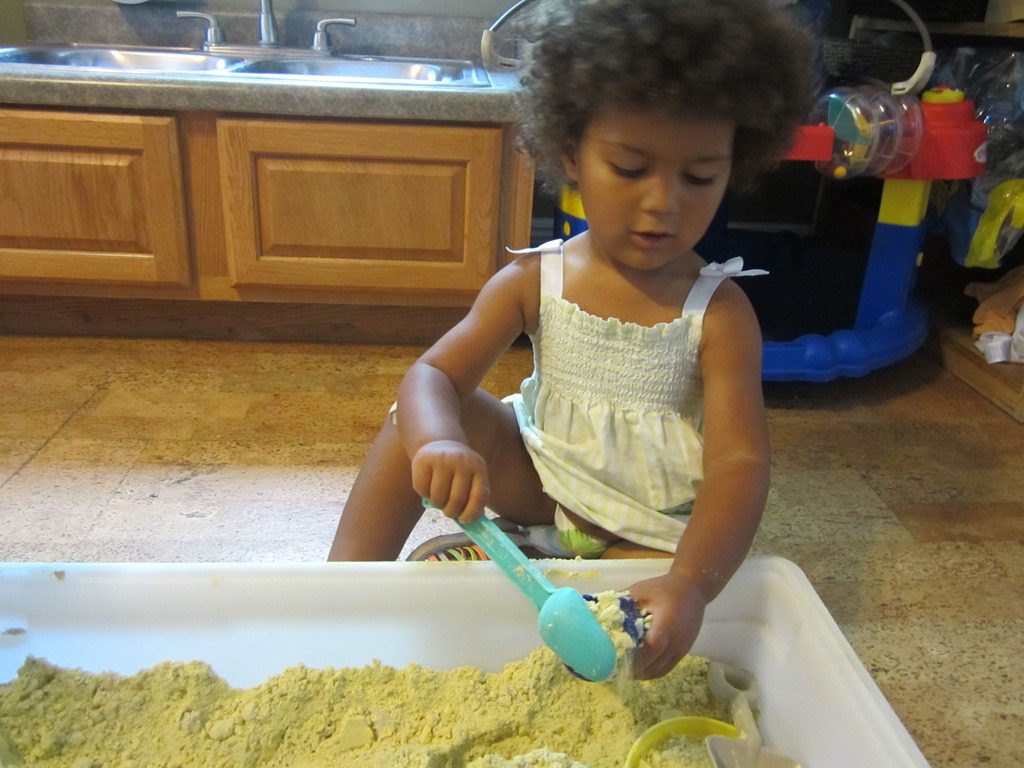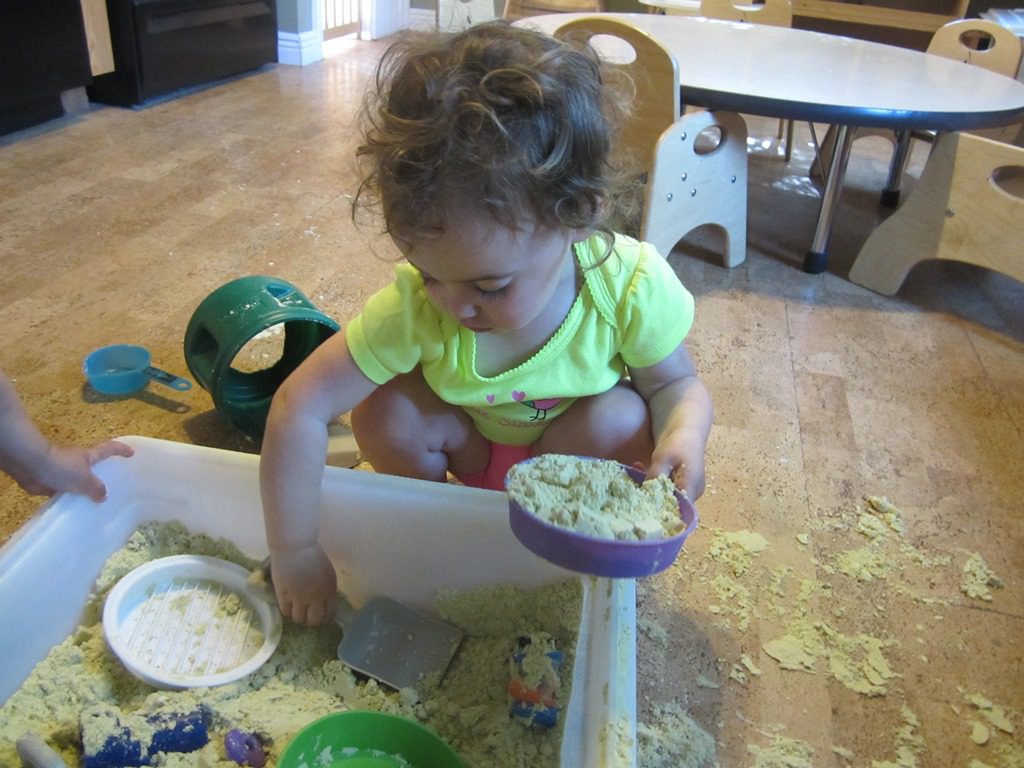 Friends got the opportunity to go into the kitchen this morning and work with moon sand. We enjoyed scooping the sand with a spoon or shovel and transferring it into a bucket.