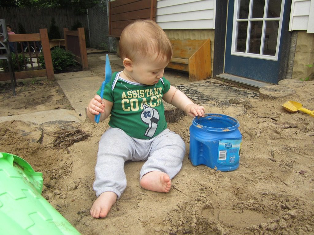 Friends headed outside this morning where a few friends headed straight to the sandbox. David enjoyed crawling around the backyard, exploring as much as he could! Maya and Nahla used shovels in the log house to transfer rocks to various parts of the play area.