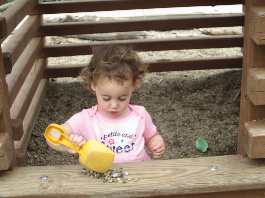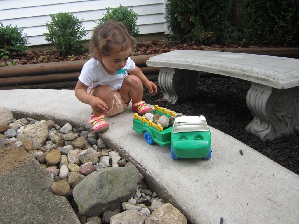 Rosemary piled up rocks in the play truck. She pushed the truck around the path before dumping out the rocks just to gather new ones!
