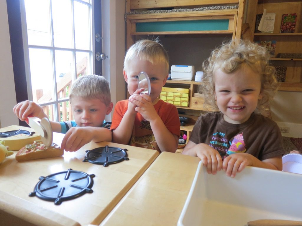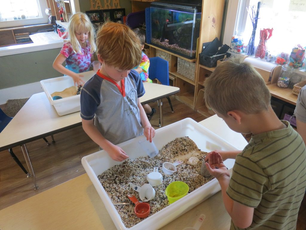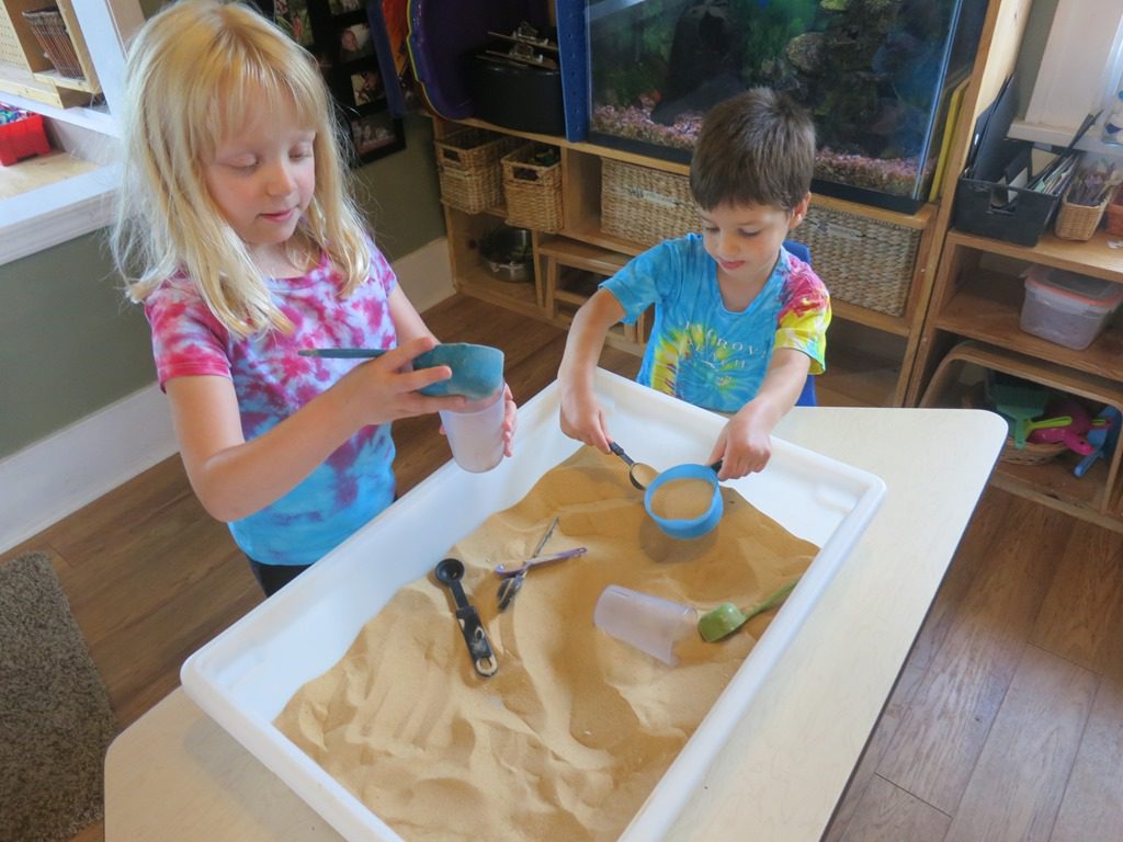We got our hands deep in the sensory tubs as sand and bird seed were available this morning. A couple kids took it upon themselves to collect all of the big black seeds from the bird seed. First, they put them all into a pile and then one by one, they placed them into a cup. Sorting at its best!