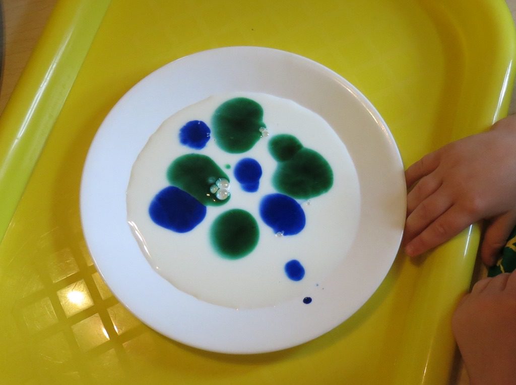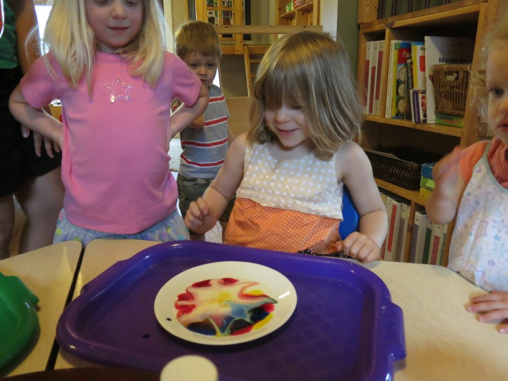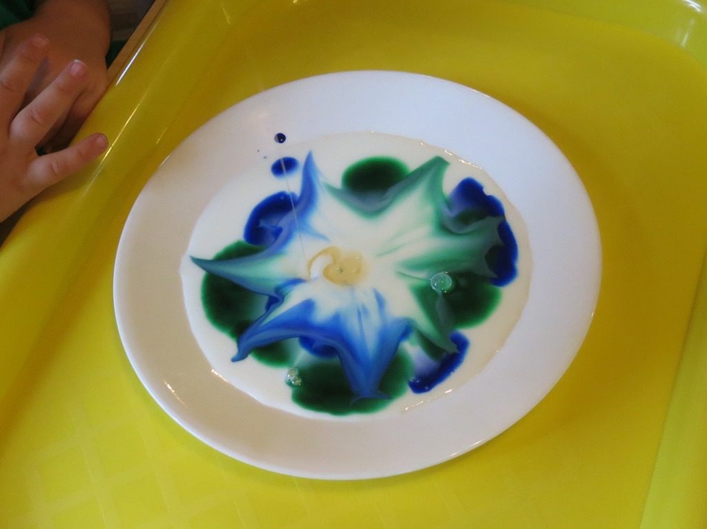 This morning the Wee Frienders experimented with some simple ingredients: milk, food coloring, and dish soap. Although there were only a few ingredients, the results were spectacular! The fats in the milk react with the dish soap leading to some interesting movement and designs: