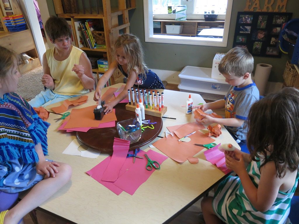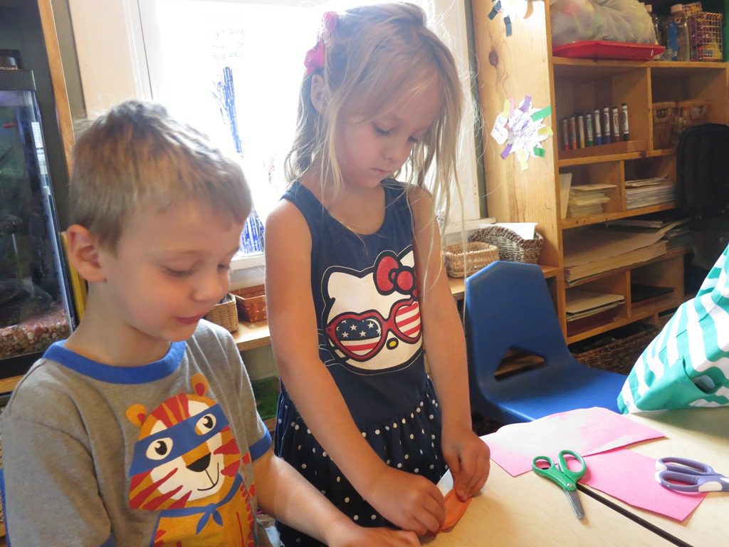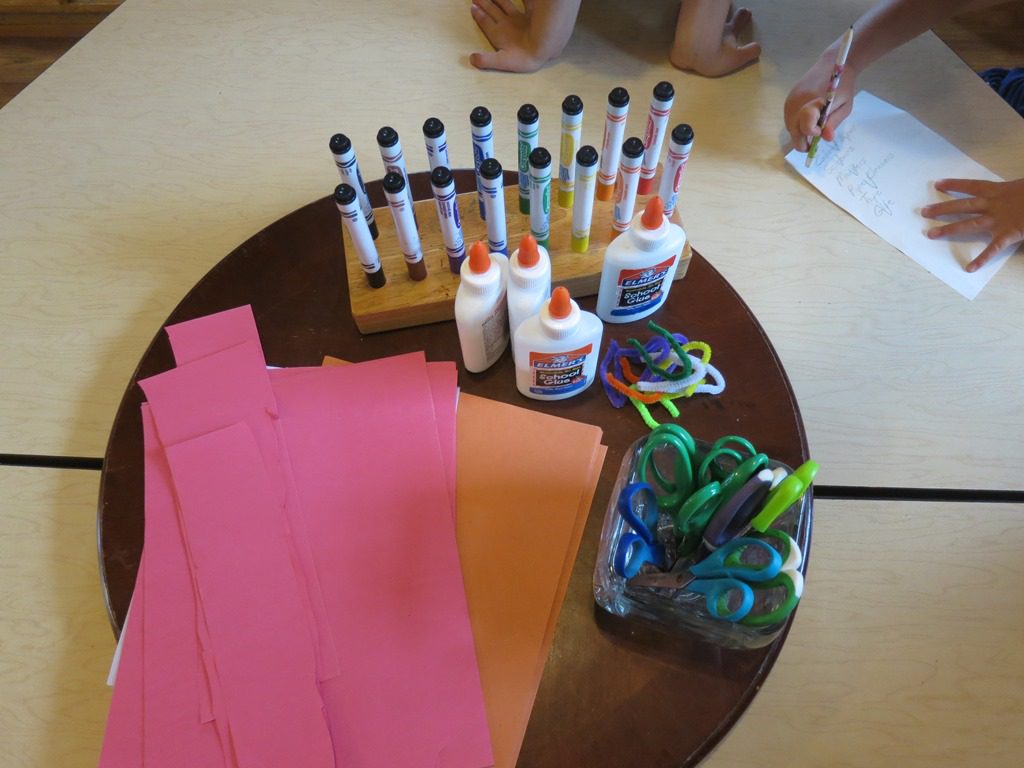 Today Sloane and Elizabeth decided to teach Wee Frienders how to make a caterpillar, just like they learned at camp last week! First, they made a list of the materials they needed. Next, they gathered all the supplies. Then, step-by-step, they taught friends how to create a caterpillar with paper, glue, and pipe cleaners.