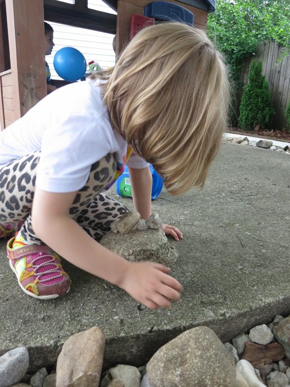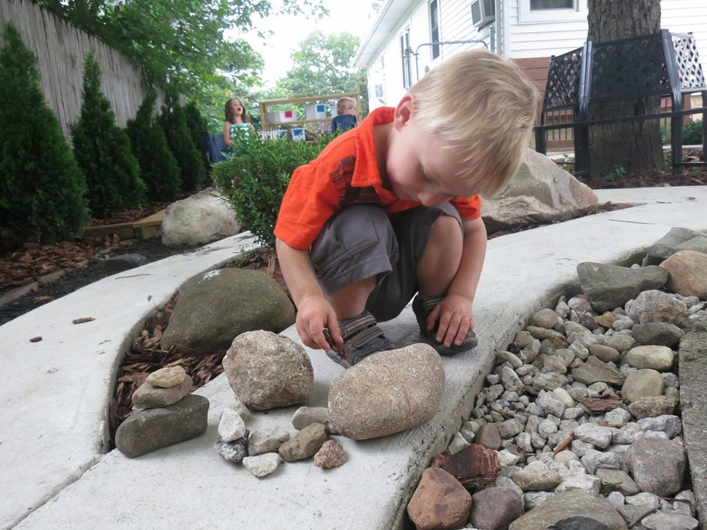 Children are full of natural creativity. Our Wee Frienders demonstrate this fact every day! We have had our new backyard area, complete with a circle of different size rocks and stones, for a few weeks now. Yet friends are still coming up with new ways to use these materials.