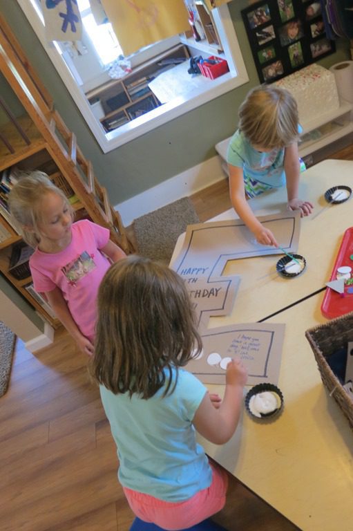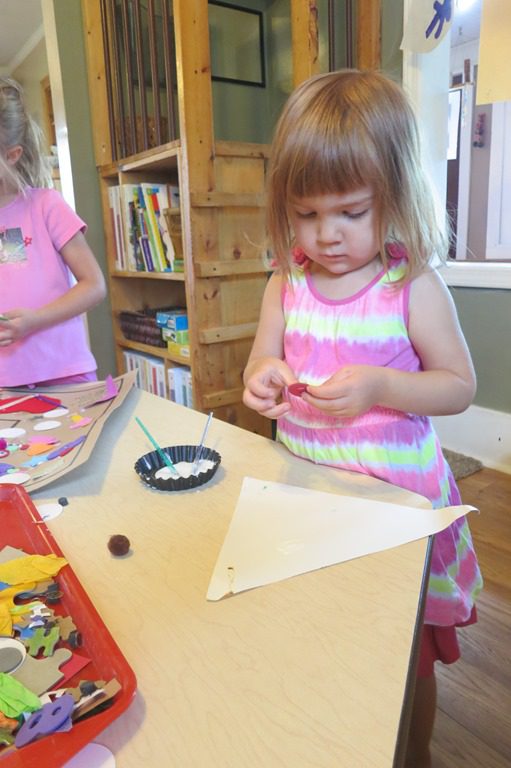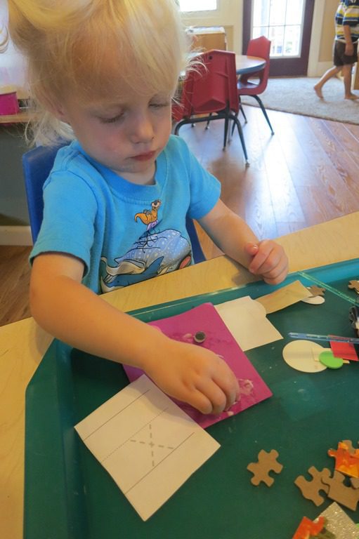 Wee Frienders took time this morning to make Eren a special “E” birthday card. With the discovery of a bunch of random art materials: felt hearts, white circles, puzzle pieces, googly eyes and more, it was a glue extravaganza!