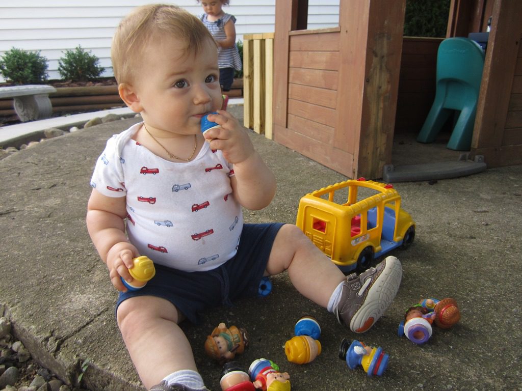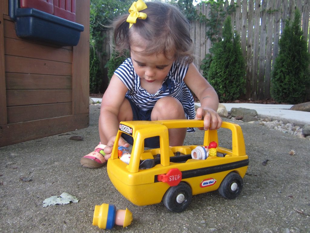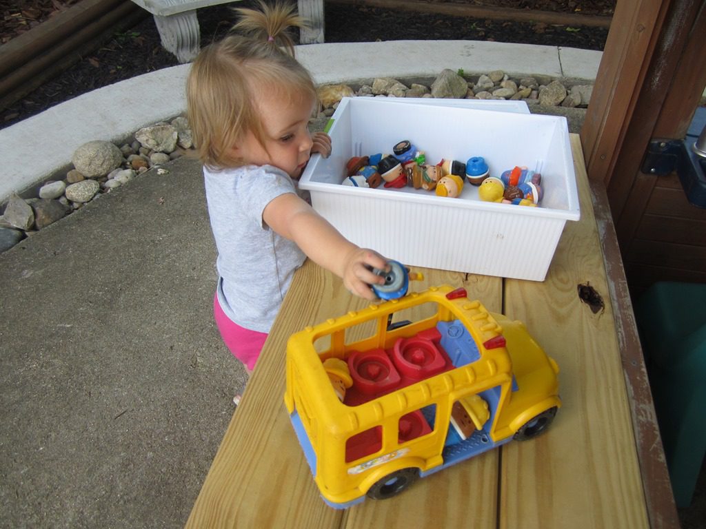 This morning, friends got out the little people toys. They all shared and put the little people in buses to drive around.