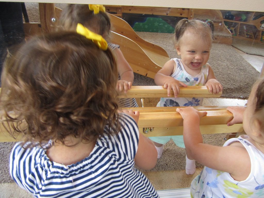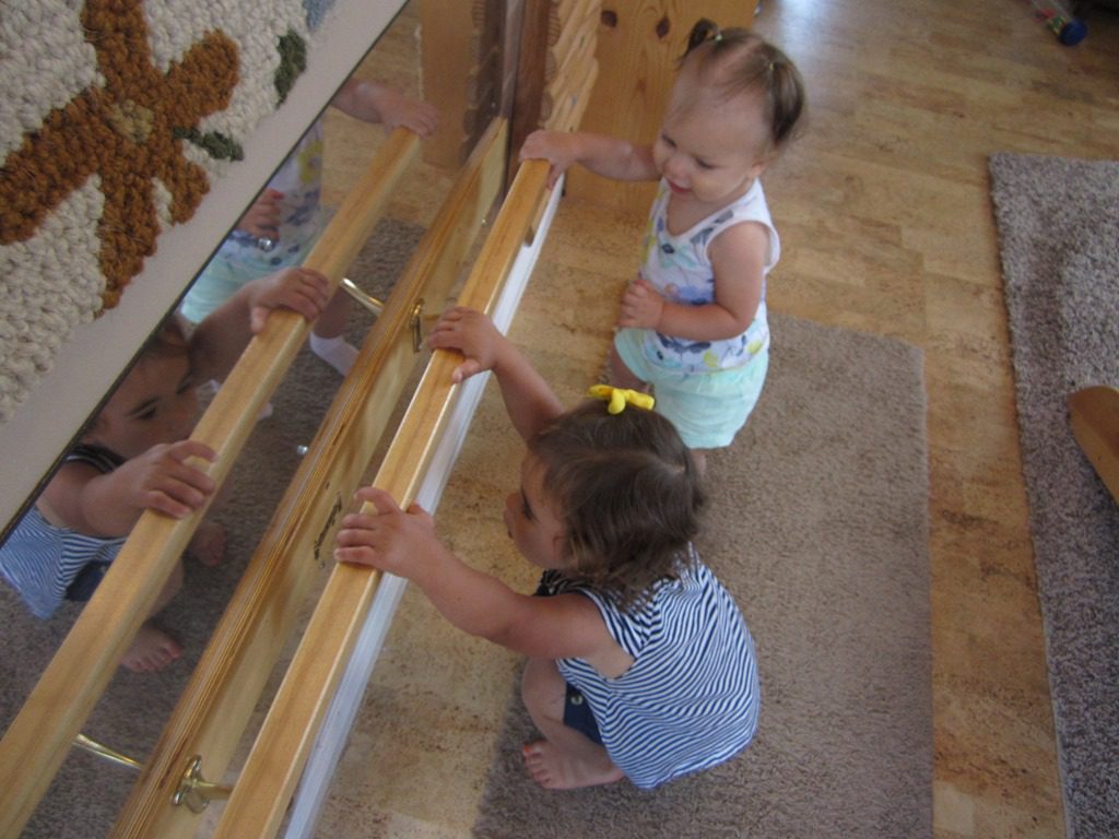 Rosemary and Annabelle giggled and jumped together in front of the mirror.