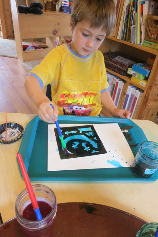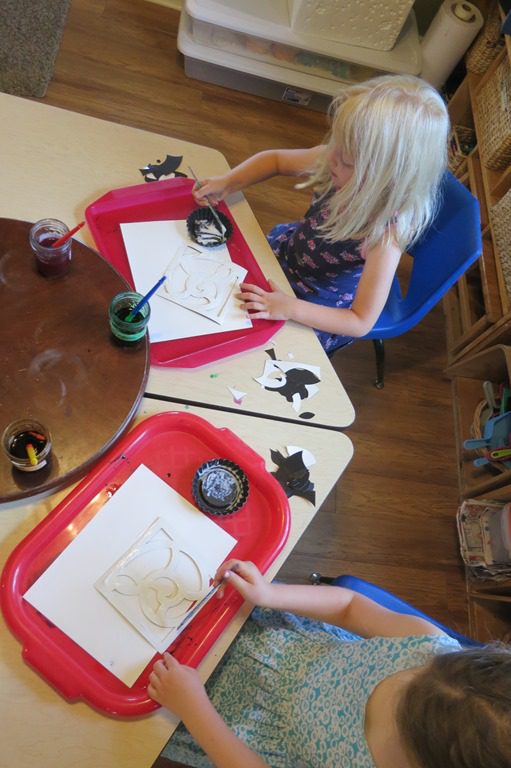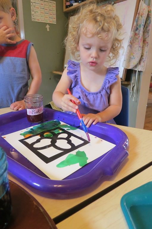 Next, they used watercolors to paint their “stained glass”. Check out the finished artwork on the clothesline in the art room!