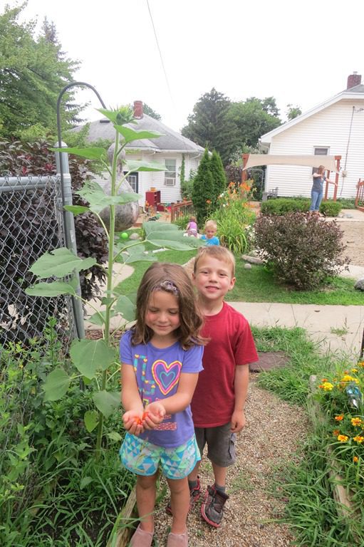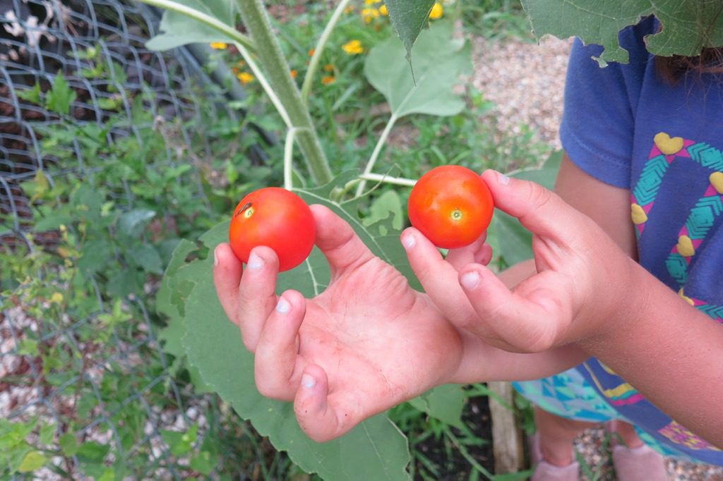 Outside we discovered tomatoes ripe for picking (and eating) and a sunflower taller than Clara and Owen:
