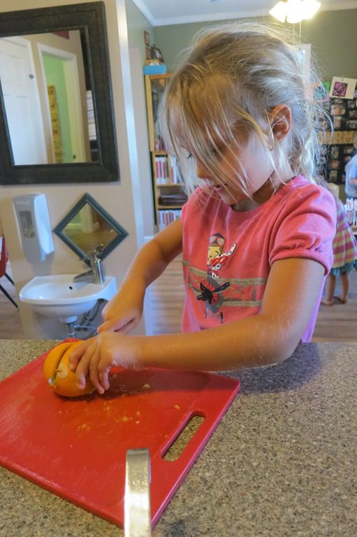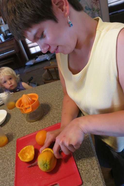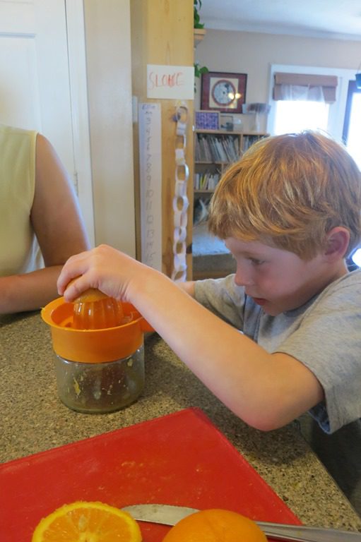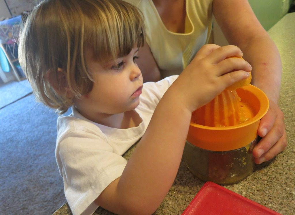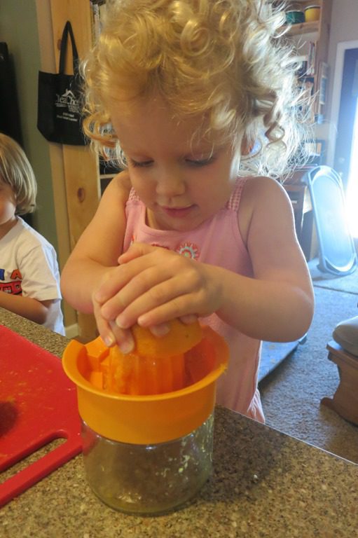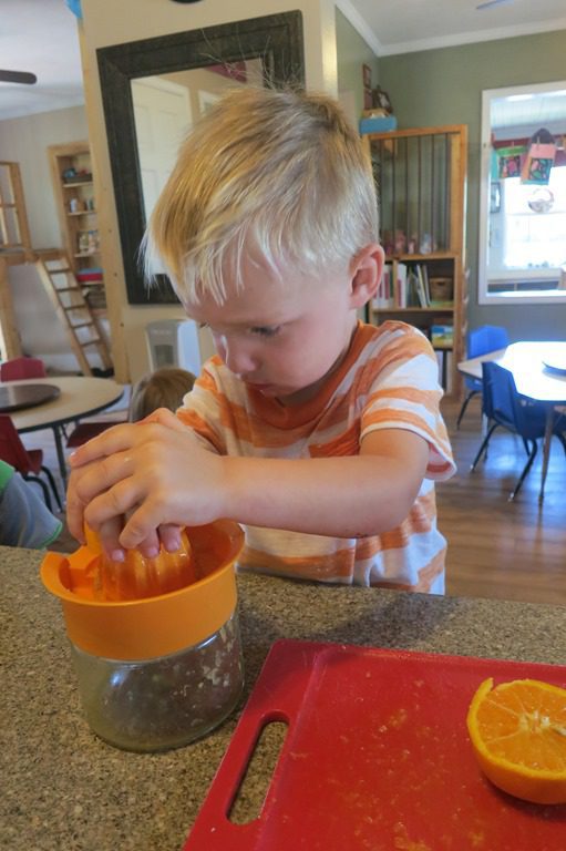 This afternoon for snack we did something a little different. Instead of having orange slices, we decided to make orange juice! First, we cut the oranges in half. Then we squeezed as much juice as we could out of the oranges before pouring it into our glasses.