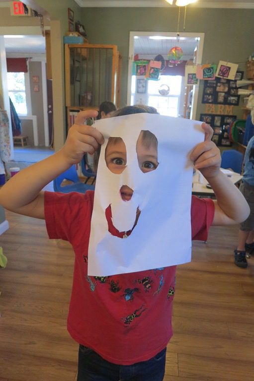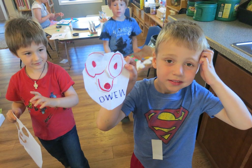 Daniel and Owen focused in on the art area as they worked to make masks. Owen chose to color his mask while Daniel cut out holes for the eyes, nose, and mouth. Every creation that our friends make is truly different and specific to each child.