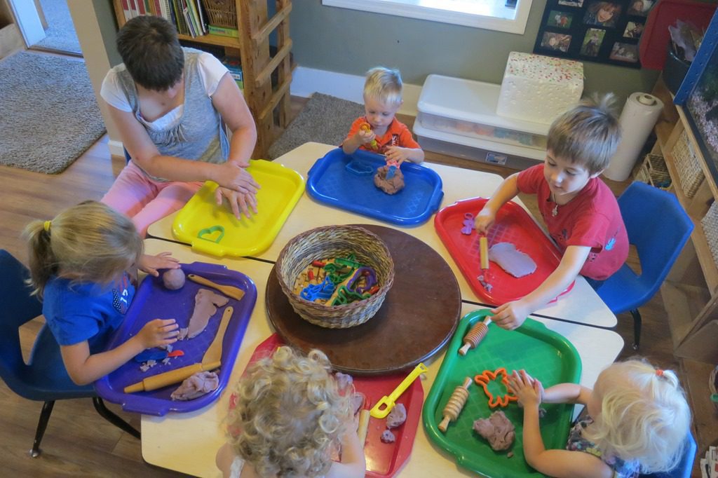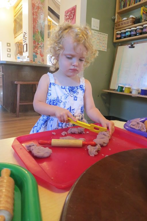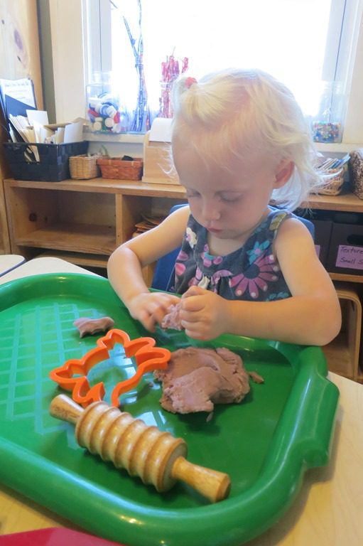 A play-dough sensory activity was made available at the art table this morning. Using tools such as spatula, rolling pin, and cookie cutouts, friends made different creations using the play-dough on their tray.