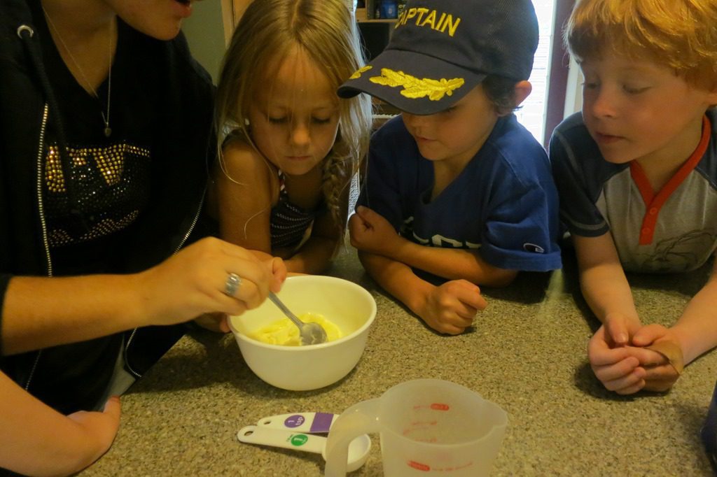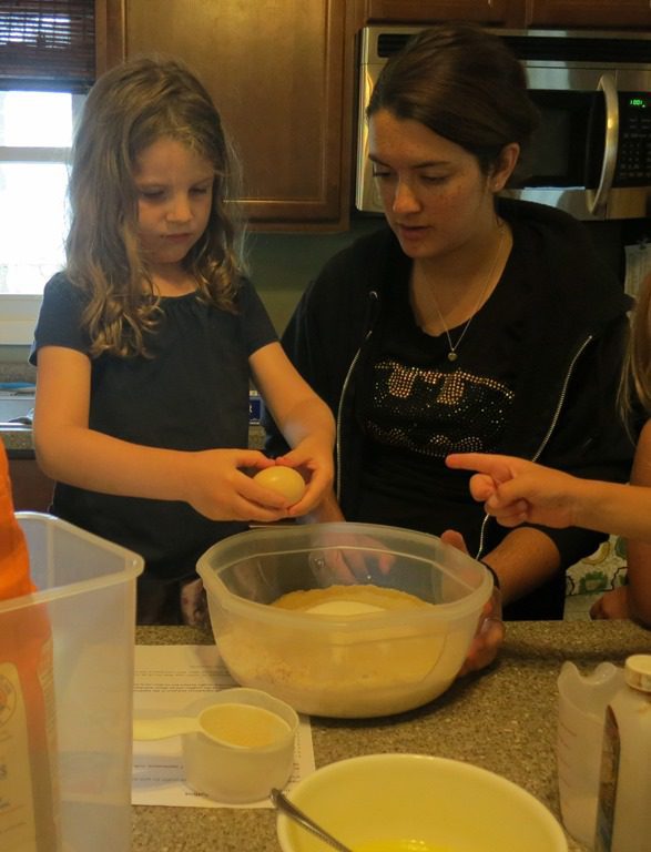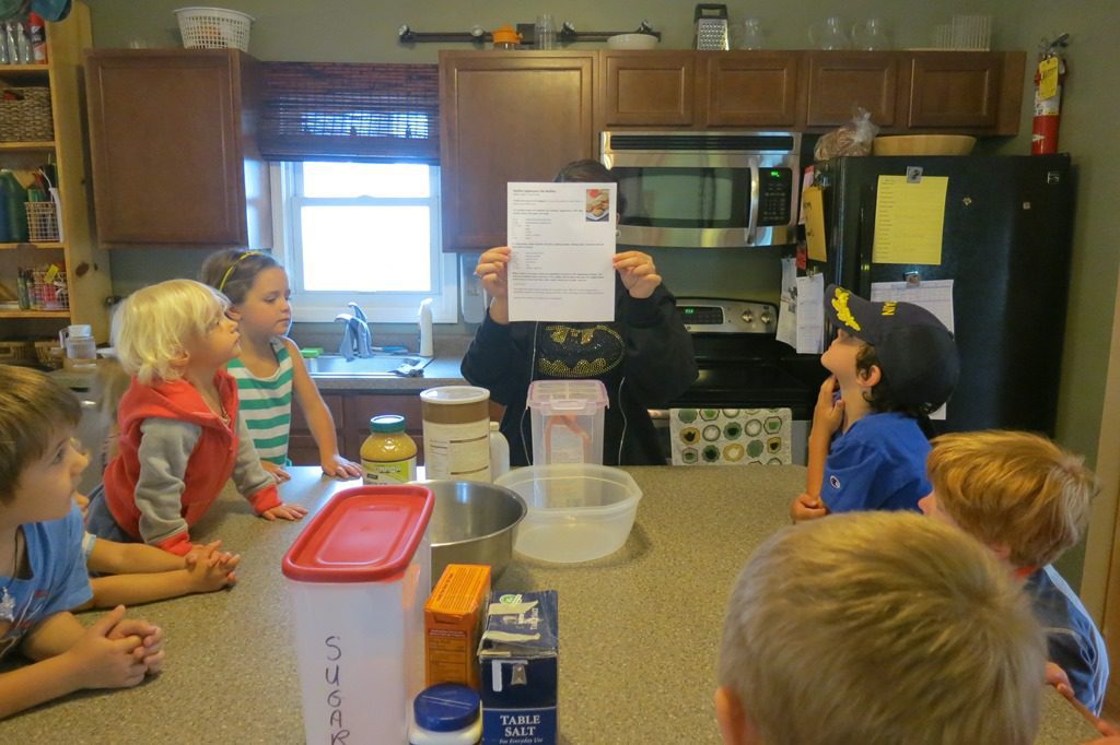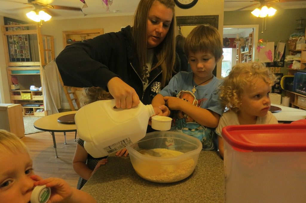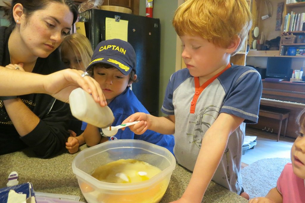 We got out two bowls: one for our dry ingredients and another bowl for our wet ingredients. Children took turns pitching it. From pouring milk to measuring whole wheat flour, our friends’ contributions were extremely helpful!