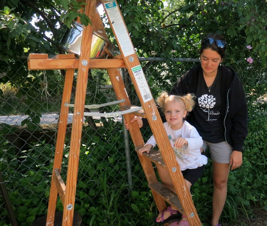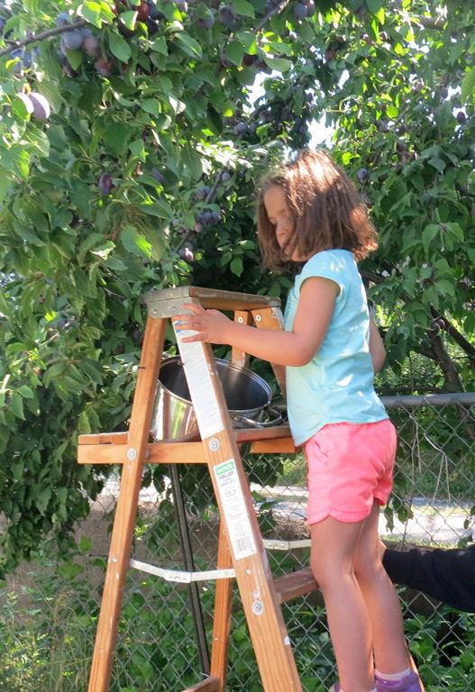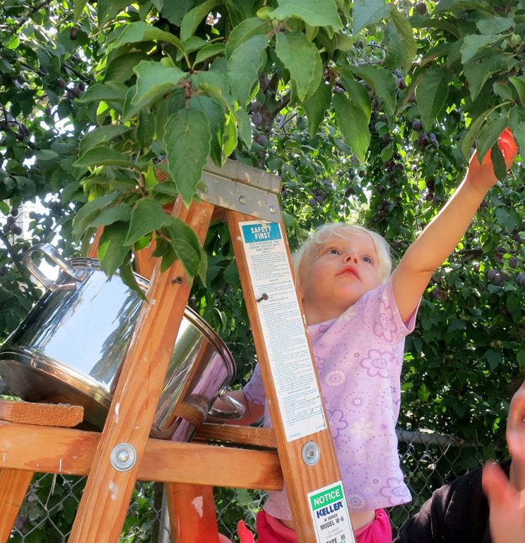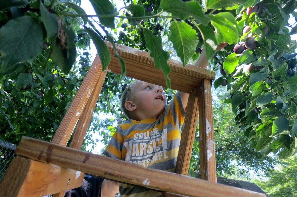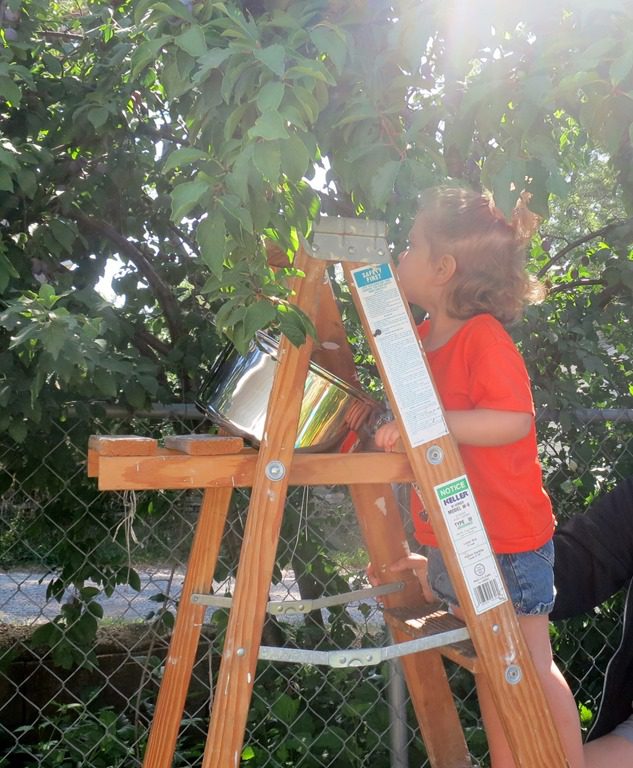 There has been so much picking lately that the lowest branches are now empty. Today we solved that problem by getting out the ladder! Friends lined up eagerly for a turn to climb up.