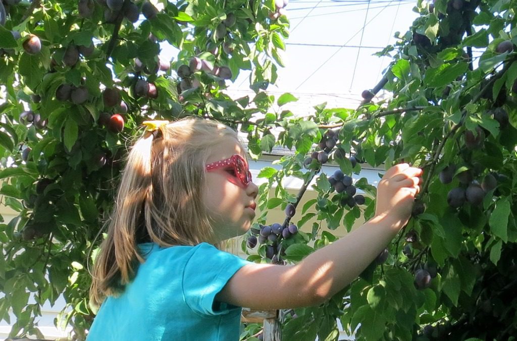 With a teacher’s supervision friends climbed up the steps and reached for the ripe plums.