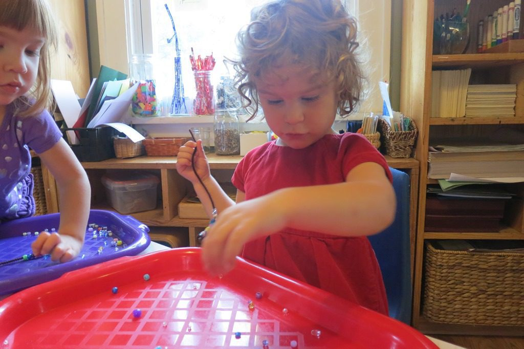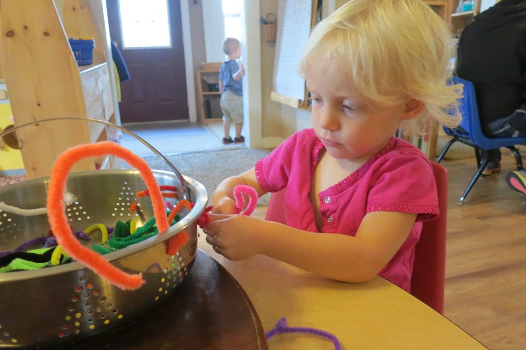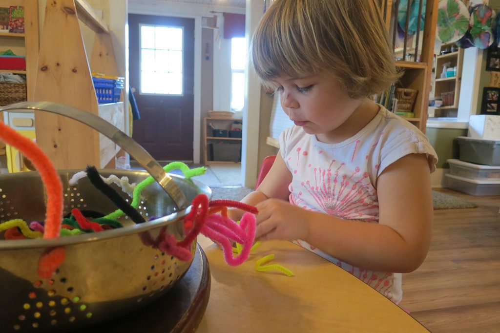 Today Wee Frienders had a lot of fine motor skill practice. This morning friends were engaged with pipe cleaners and a strainer: