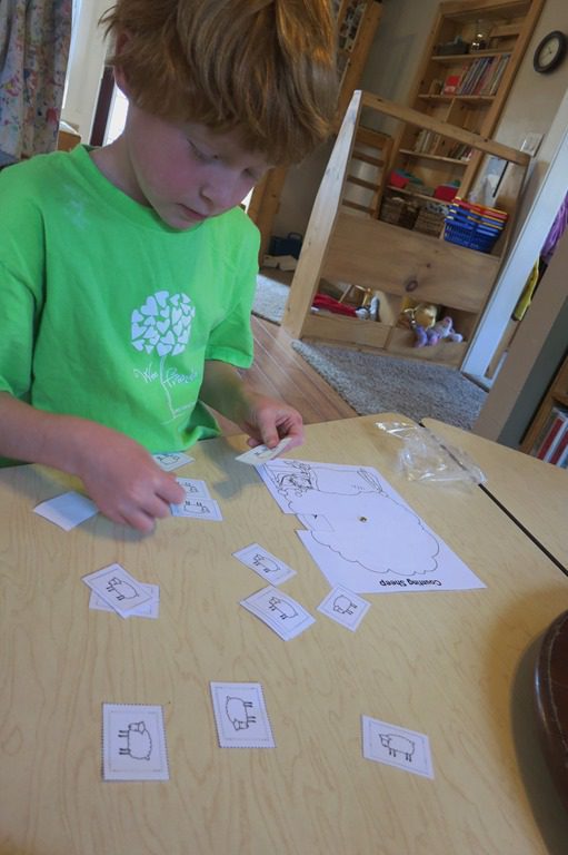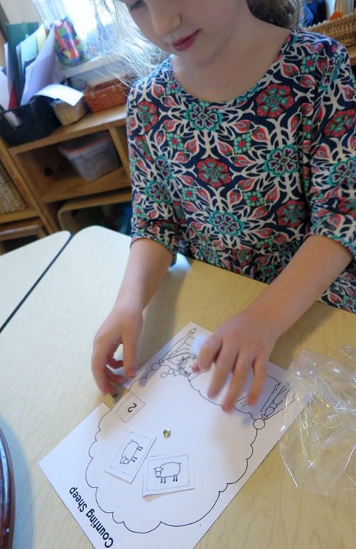 Kindergarten: Today the kindergarteners played a counting and one-to-one correspondence game called “Counting Sheep.” This work then evolved to predicting how many sheep were in a pile, counting the actual number and then figuring out how many sheep you were off by. Elizabeth and Elliott were particularly engaged because they made up the rules of the game!