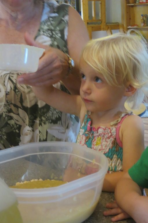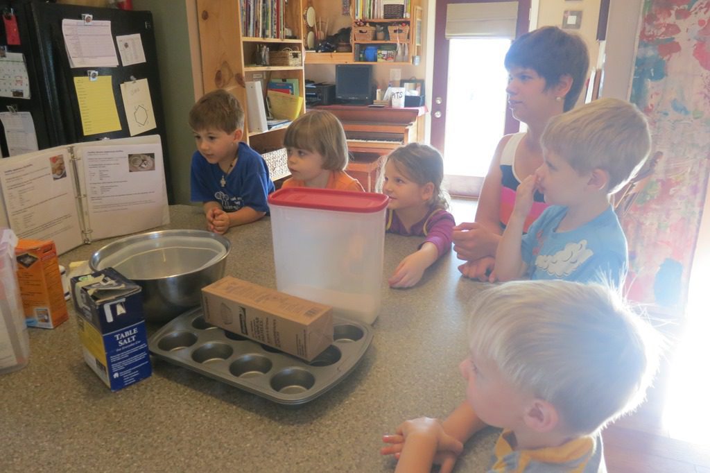 Children gathered around the island to bake healthy muffins for our afternoon snack. Every friend got a turn to help measure either a wet or dry ingredient.