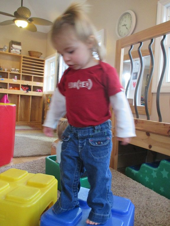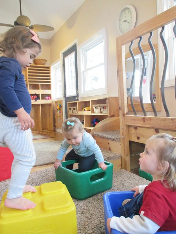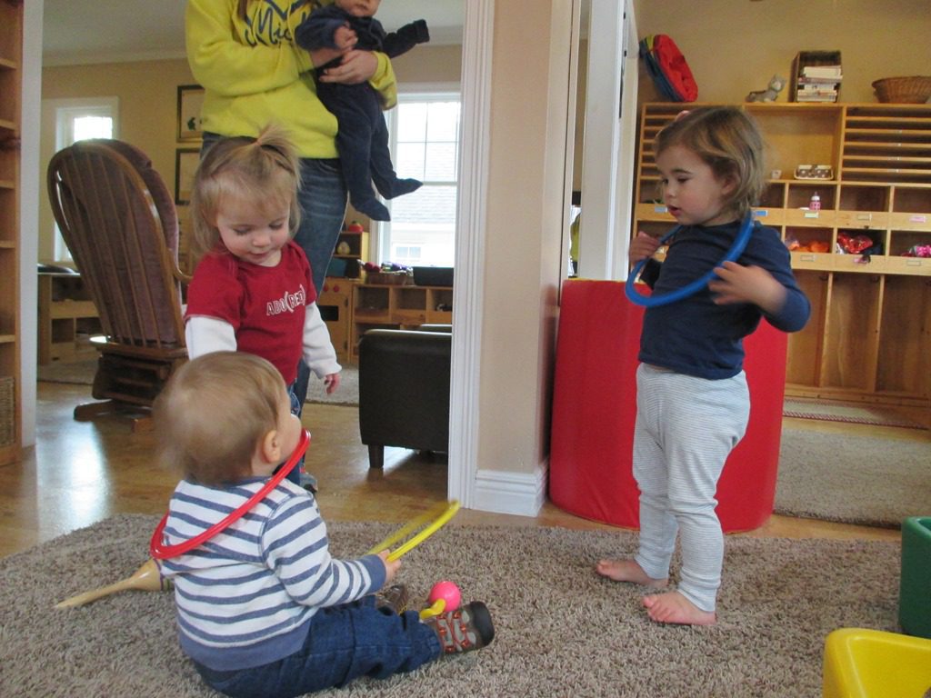Our friends spent the rest of the morning playing with blocks and rings in the gross motor area. Everyone loves wearing the rings like necklaces!