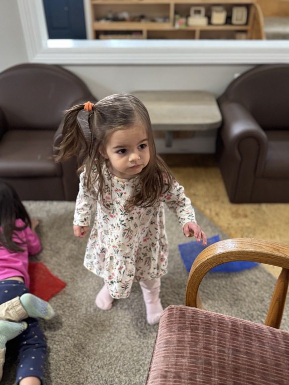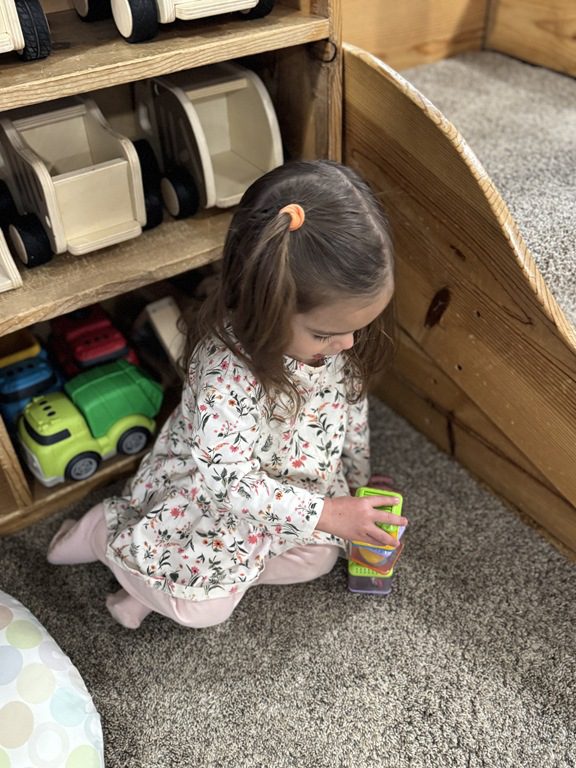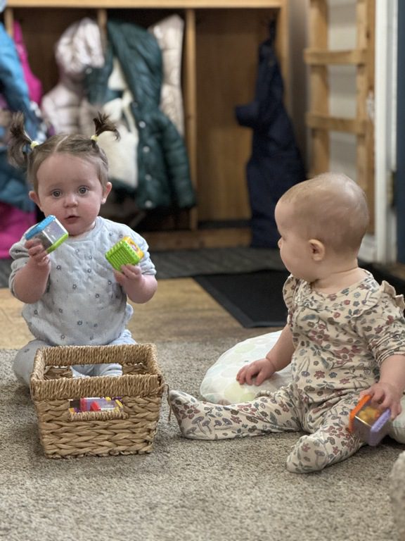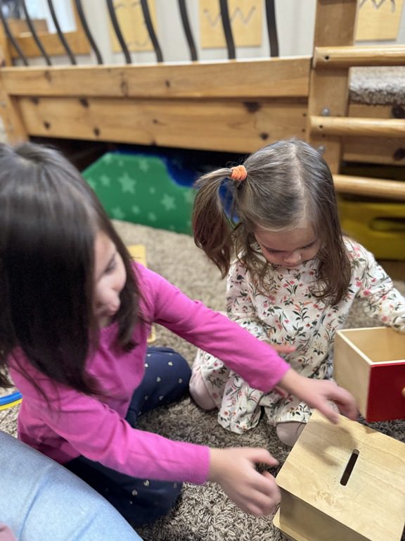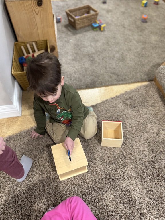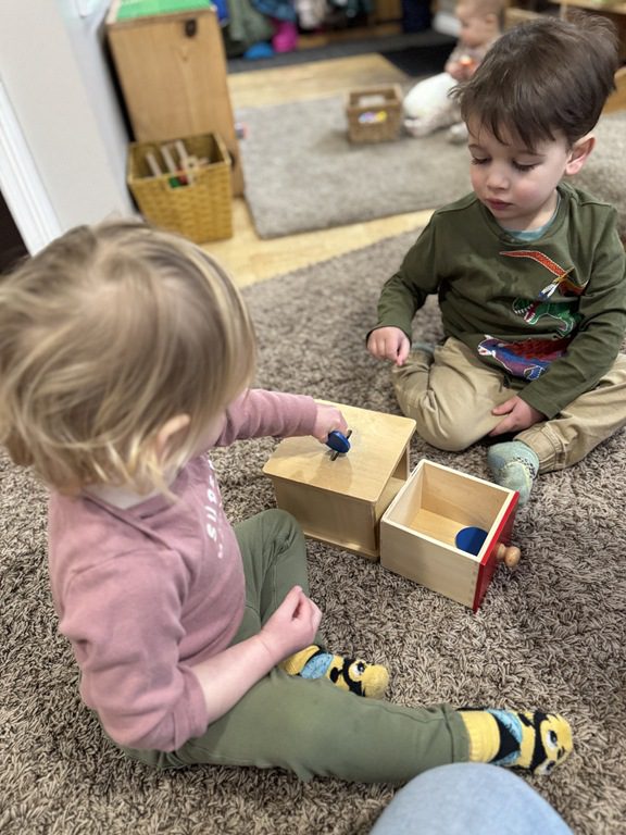 This morning, we engaged with object permanence boxes and played with peek-a-blocks.