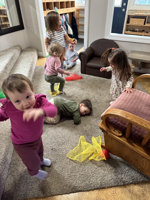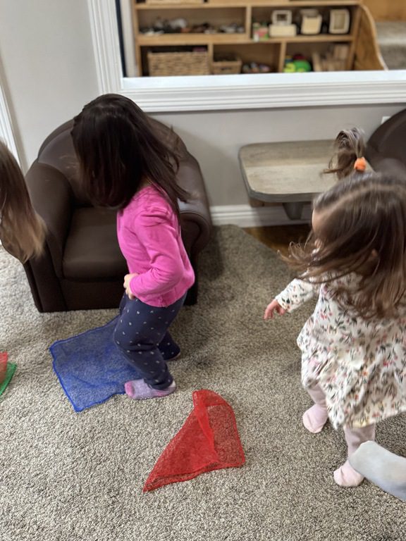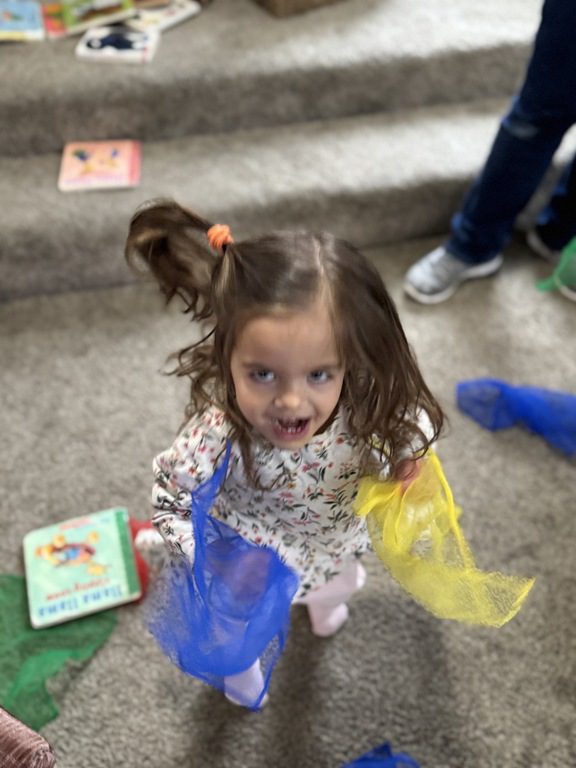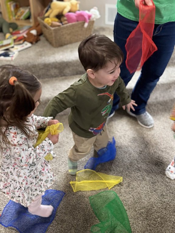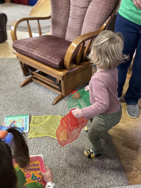 Then, we brought out the scarves and did some dancing! Miss Bekah played many versions of “Shake Your Sillies Out” while we danced with scarves, then we danced to “Sleeping Bunnies.” Baby Rose joined in the jumping in her bouncer!