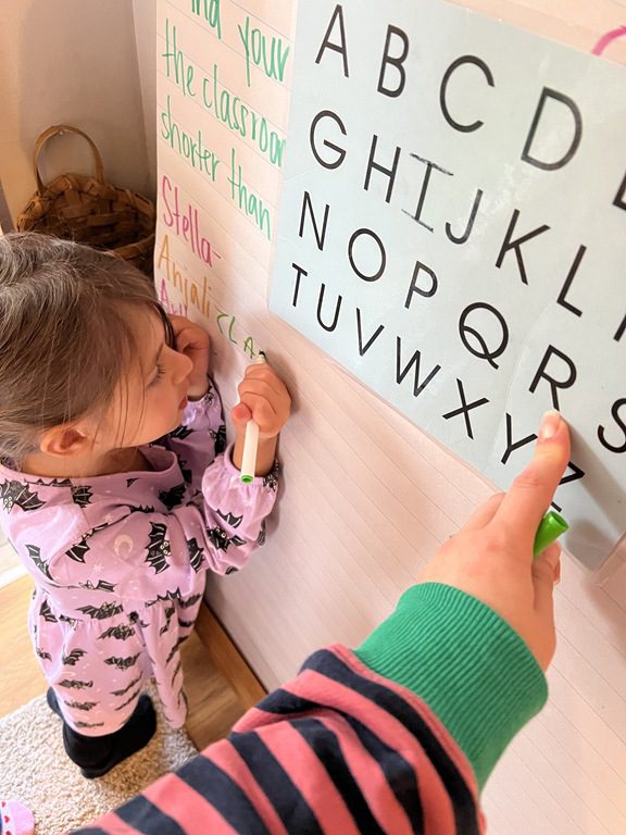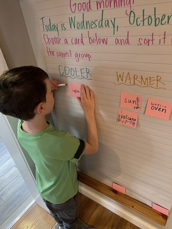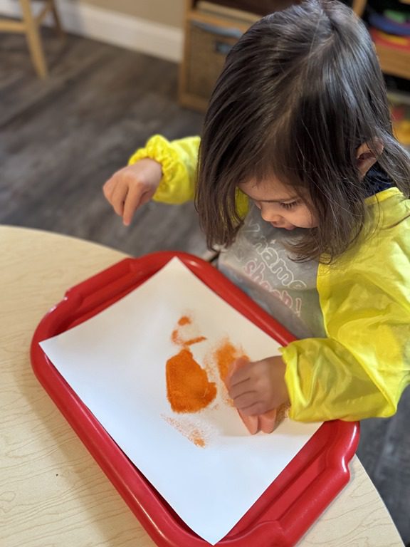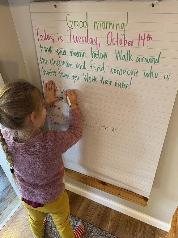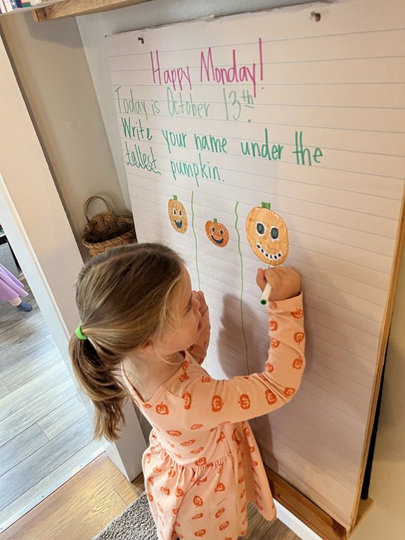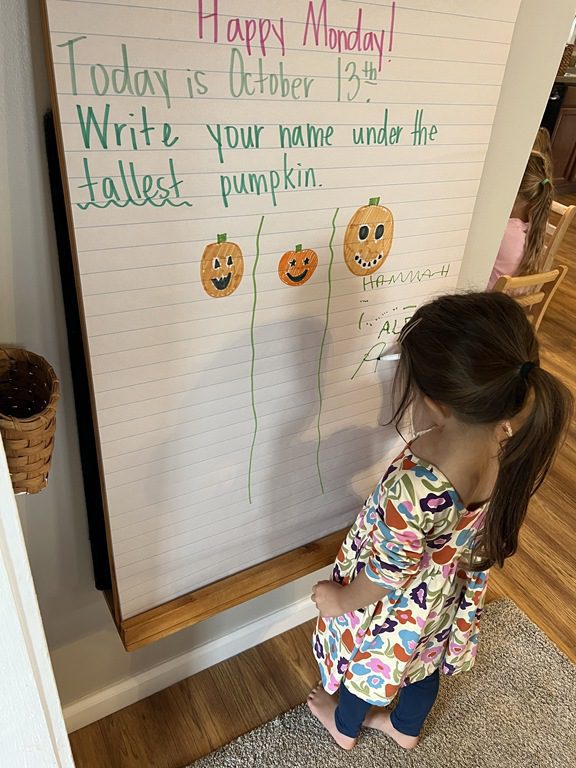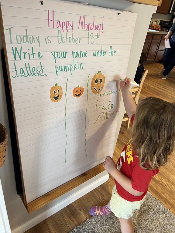 Halloween and pumpkins have been a hot topic lately so we used Jack-O-Lanterns as the headliner for our PREK1 sign in! Children looked at three different sized pumpkins and wrote their name under the tallest.