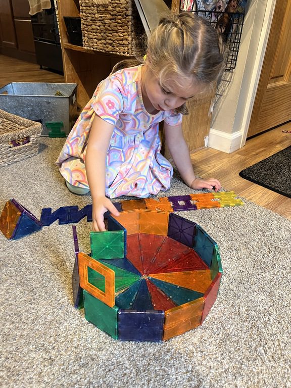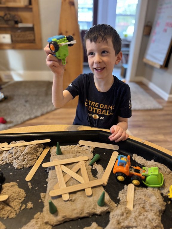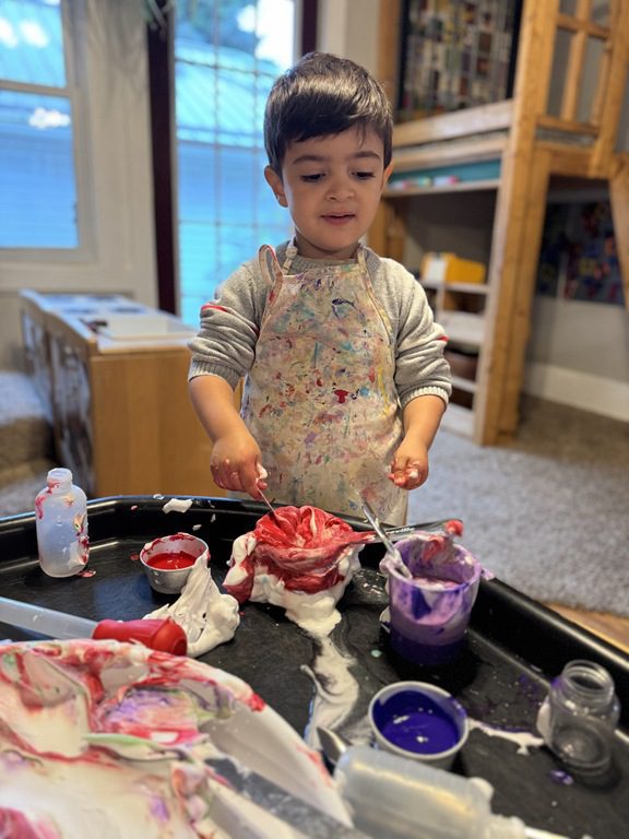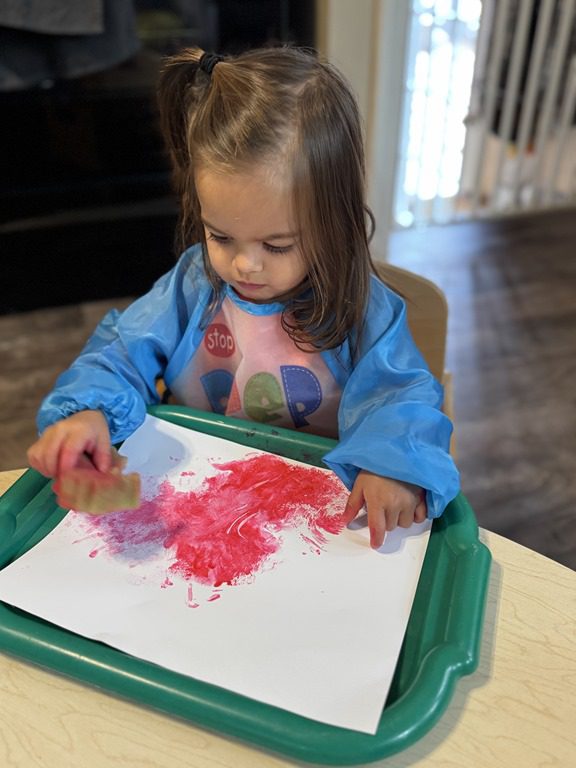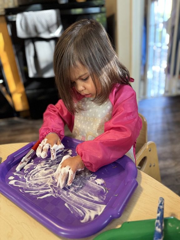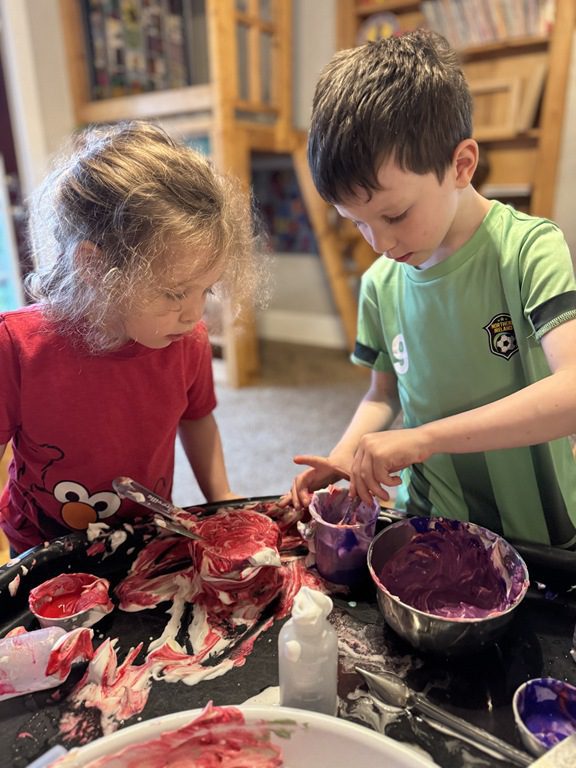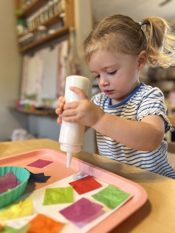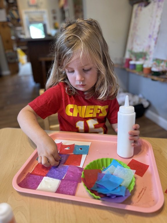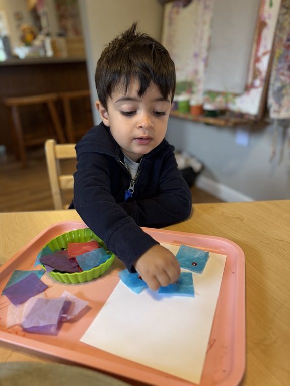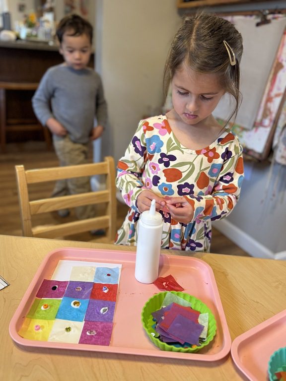 In the art center friends explored some new art materials for collage. Several kids became interested in creating a checkerboard pattern and then adding the sequins in the middle on each square, creating a very symmetrical collage. Others took a more layered and asymmetrical approach. Both were great and the kids loved making their collages.
