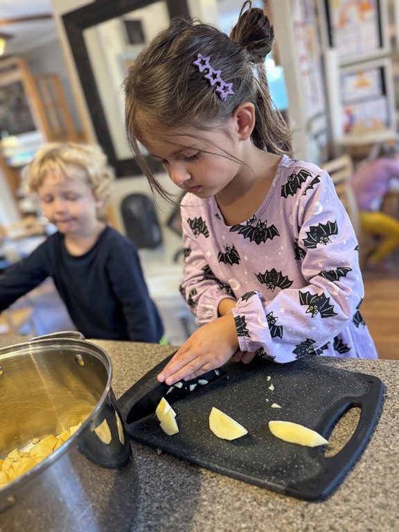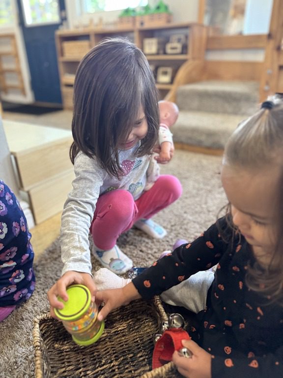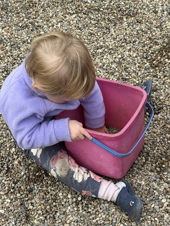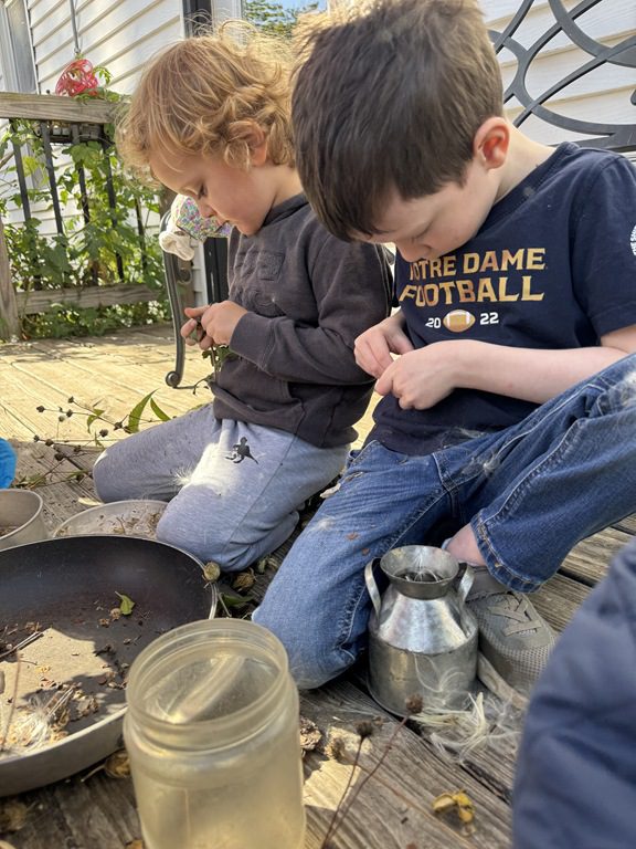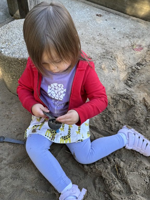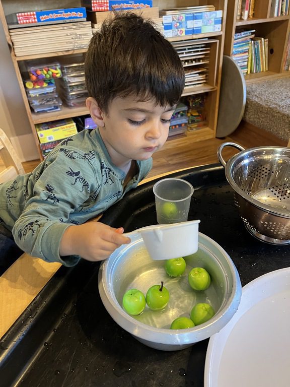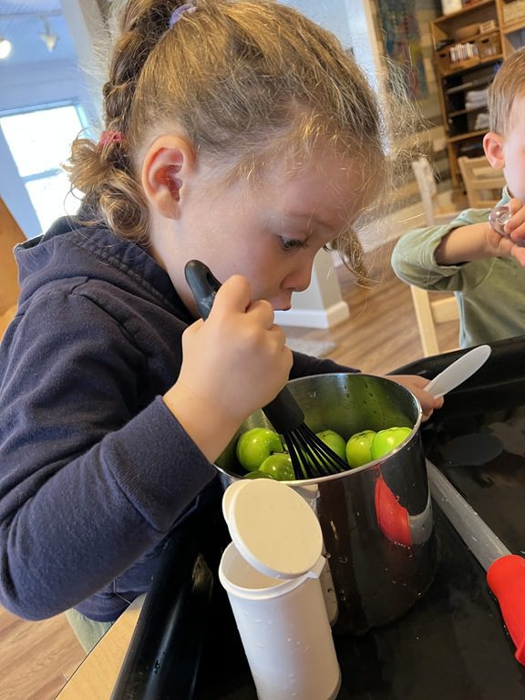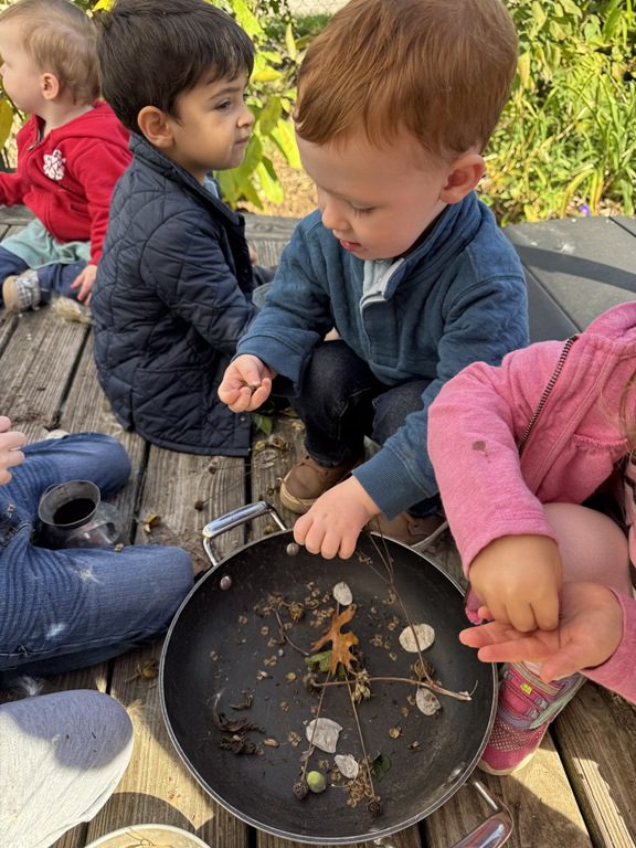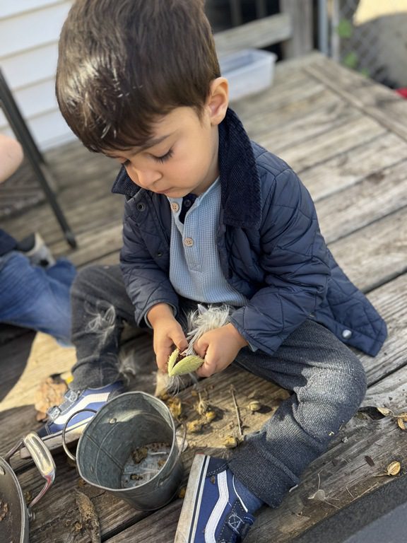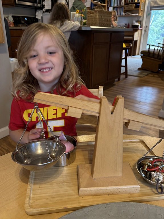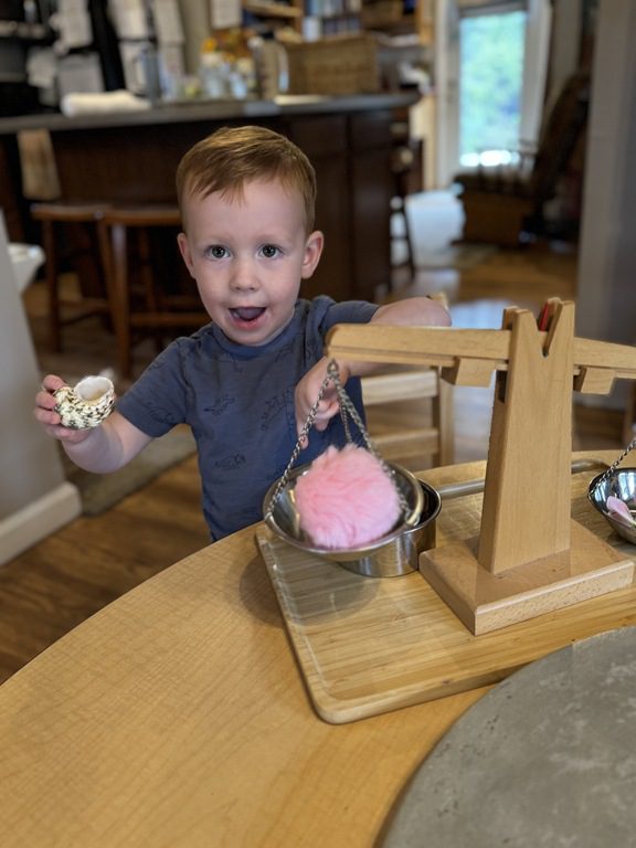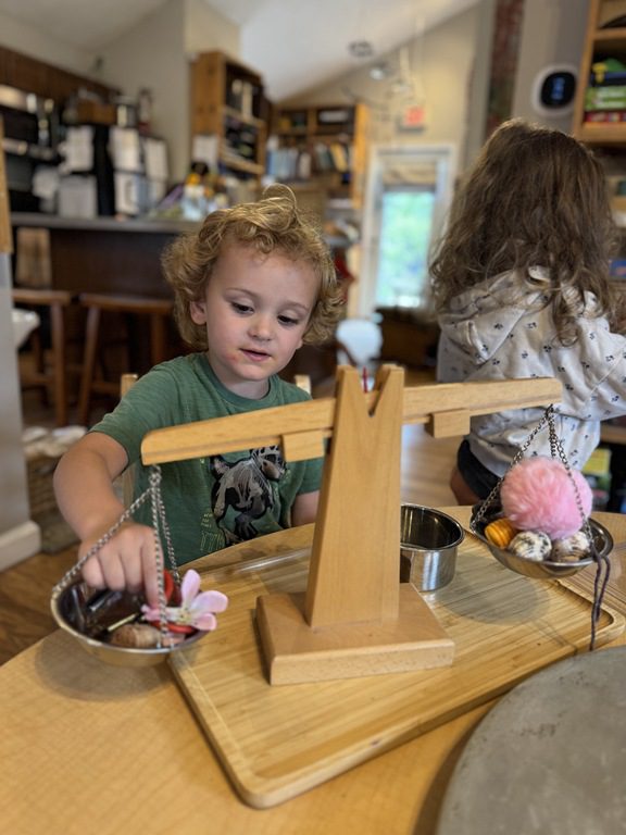 Today we explored how to use a scale. We tried a variety of objects to contrast against each other from stones to puff balls. We found that our heavier objects tipped the scale down. We also found we could put similar objects on either side of the scale to balance it. Many friends enjoyed taking things in and out and watching the scale tip up and down. Many of our kids seemed to have a good grasp of what was happening and why as they finished exploring!