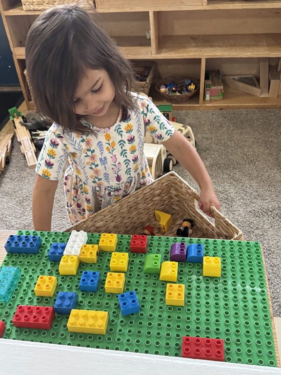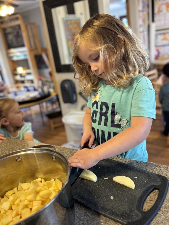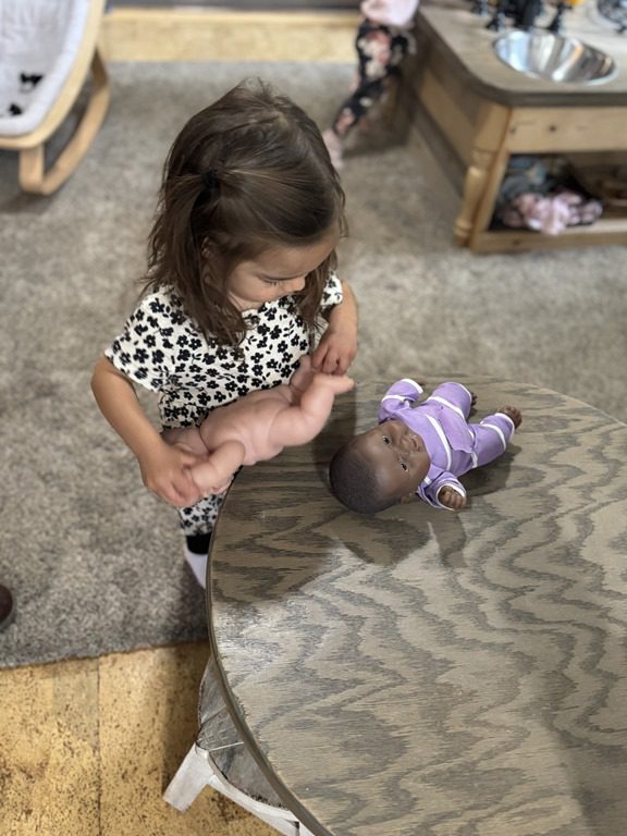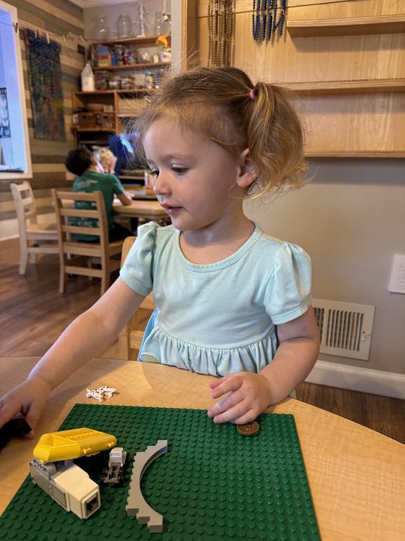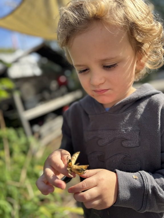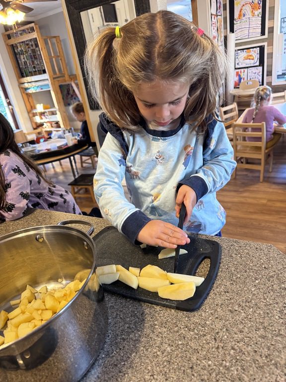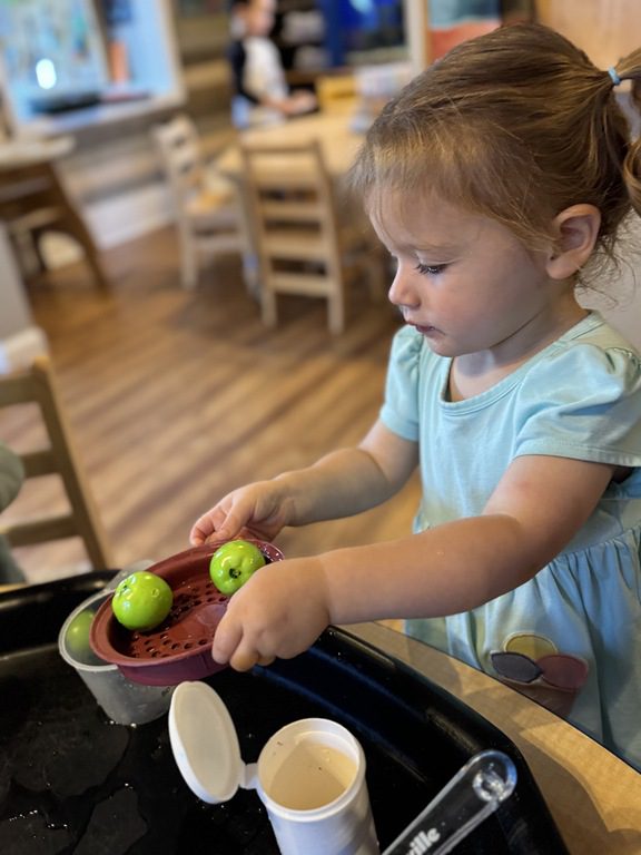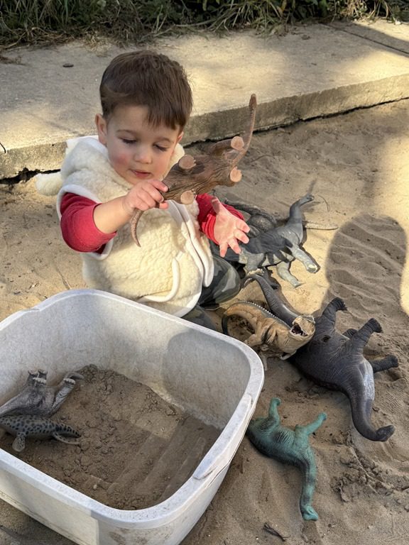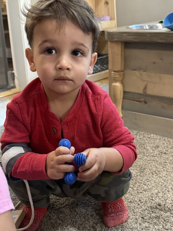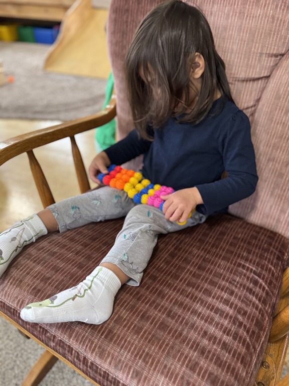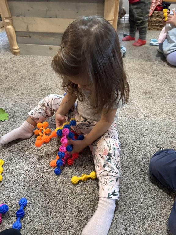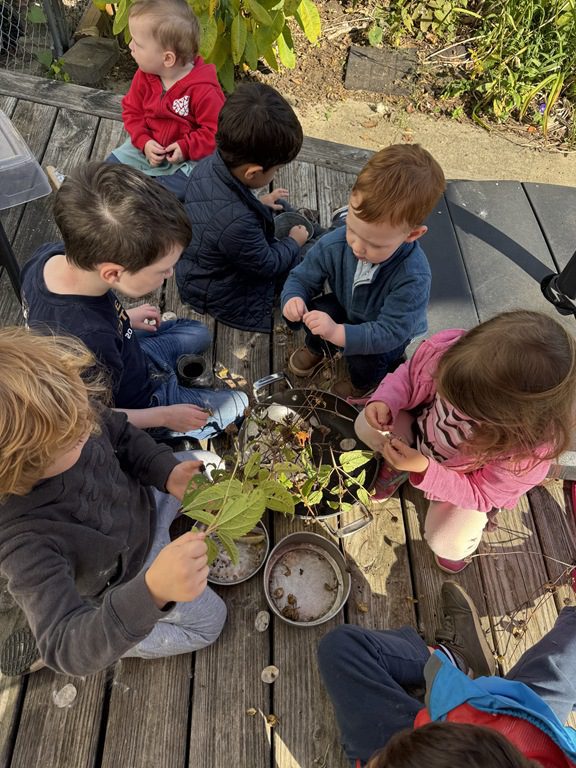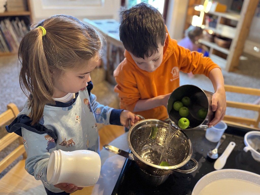 Today we explored how to use a scale. We tried a variety of objects to contrast against each other from stones to puff balls. We found that our heavier objects tipped the scale down. We also found we could put similar objects on either side of the scale to balance it. Many friends enjoyed taking things in and out and watching the scale tip up and down. Many of our kids seemed to have a good grasp of what was happening and why as they finished exploring!