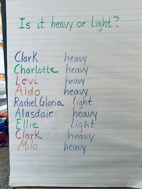 PREK2: In group we talked about things that were heavy and things that were light. We chose an object from the bowl and then decided if the object we picked was heavy or light. Our teacher recorded what we thought on the board.