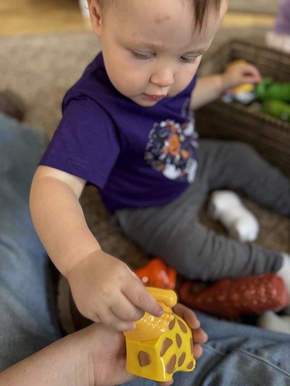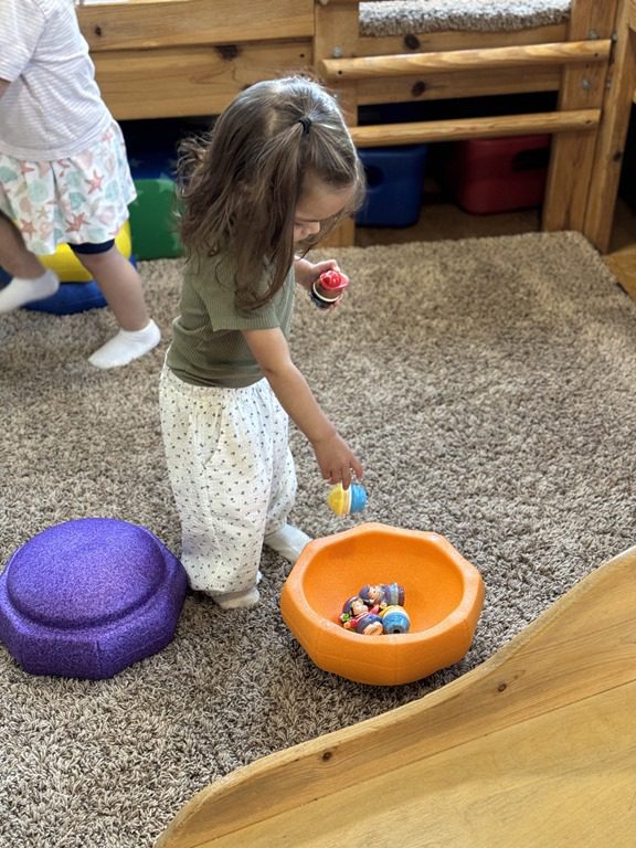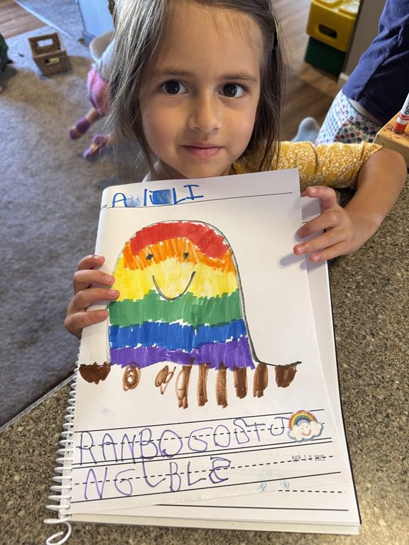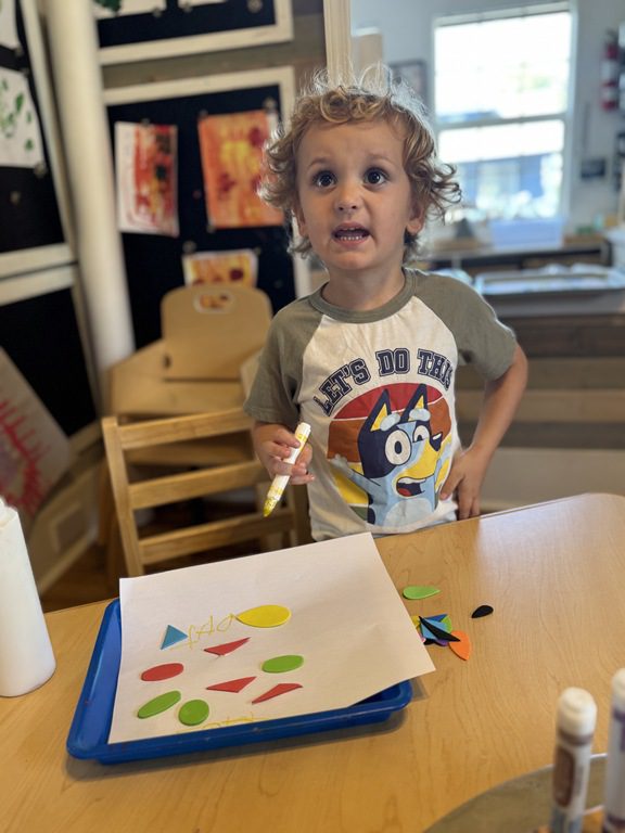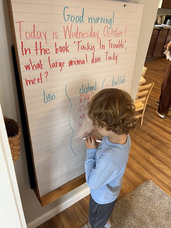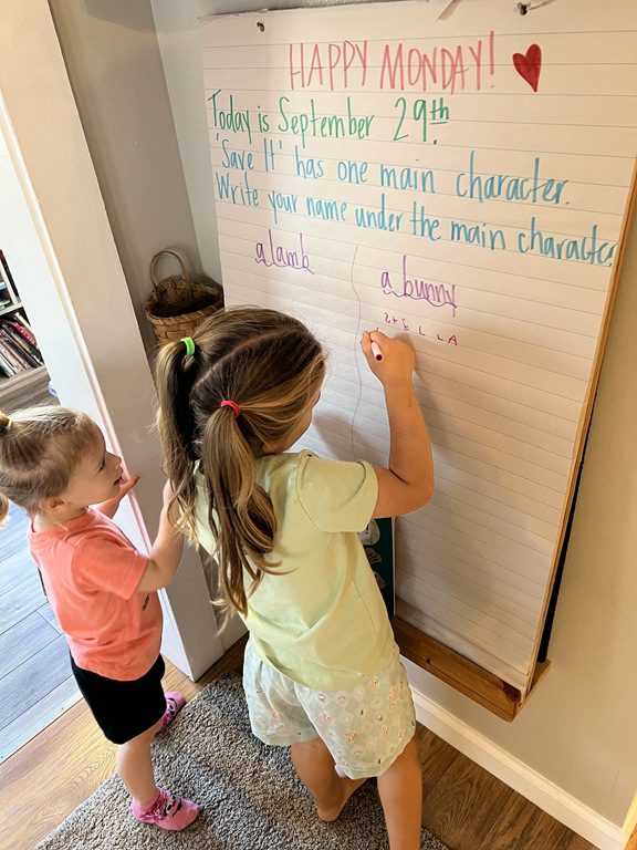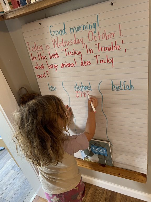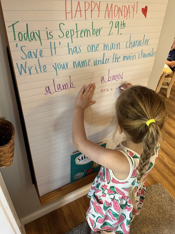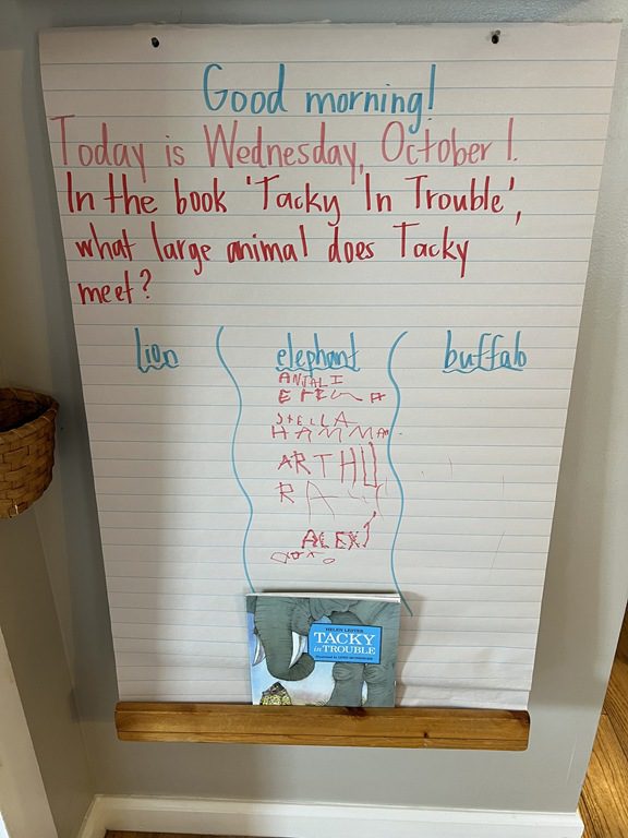 PREK2: Today in group we read the story “The Creature of Habit”. We are learning about parts of a story like characters and settings. At the end of group, we picked which was our favorite Character, the very big or very small creature. We added our name to the board under the character we picked.