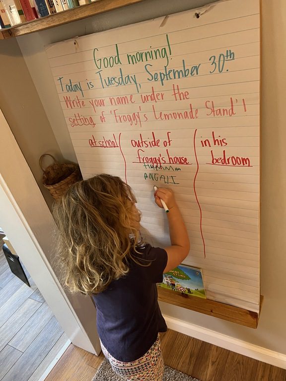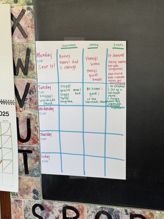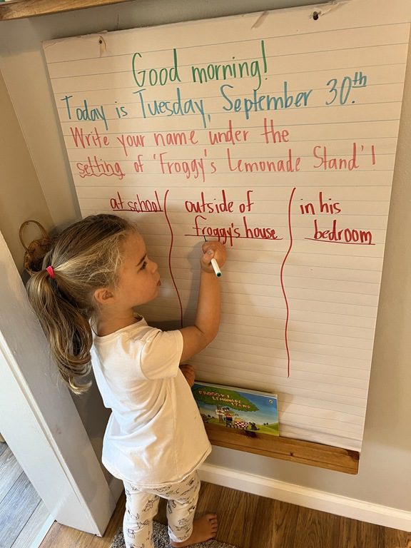 She read my mind! We used ‘Froggy’s Lemonade Stand’ to help us identify the setting. Children chose from three different settings and wrote their name under the correct setting of the book.
