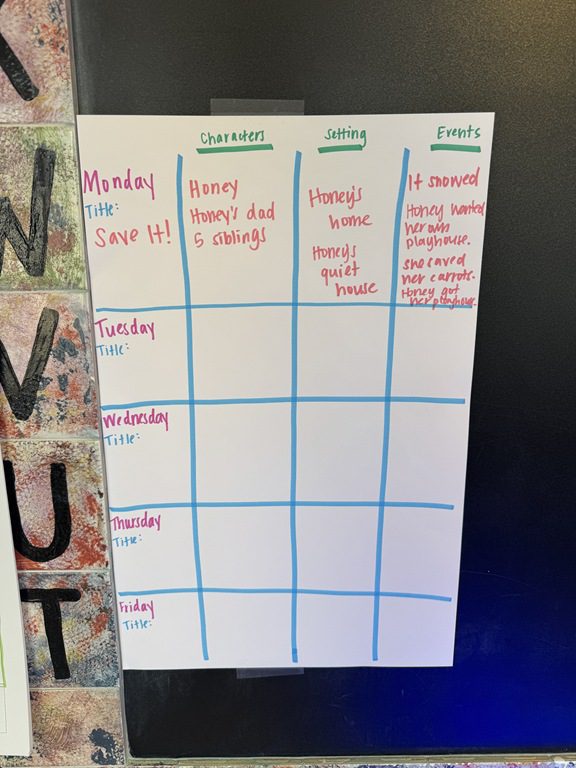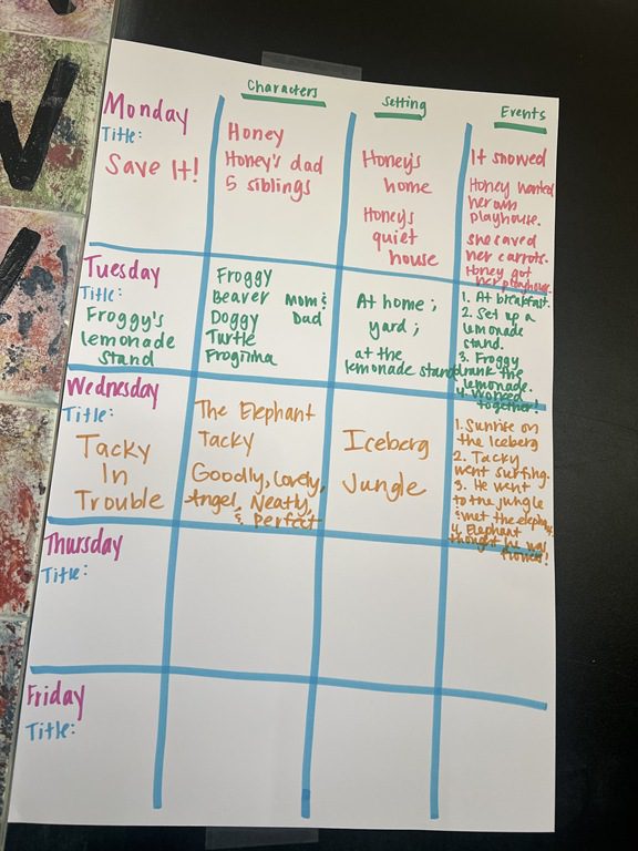 One friend added that a character in the story was the lemonade stand. This allowed us to have a meaningful conversation about characters and the things we look for in characters. We talked about how the lemonade stand was an important aspect of the story but it wasn’t a character because it didn’t talk or speak in the story.