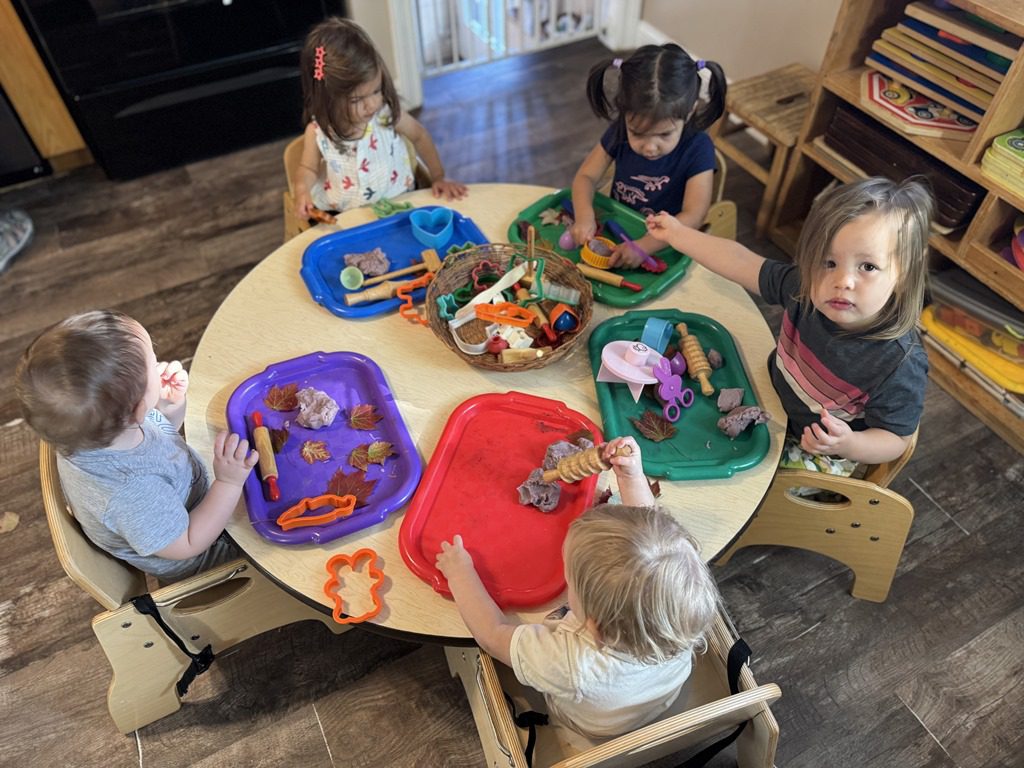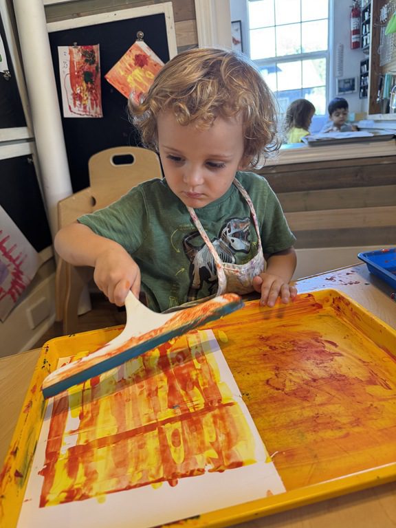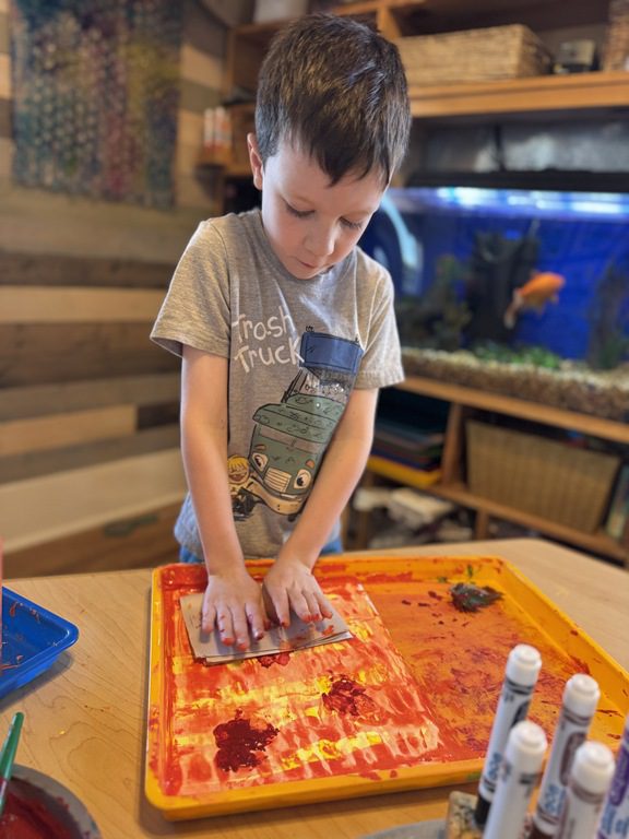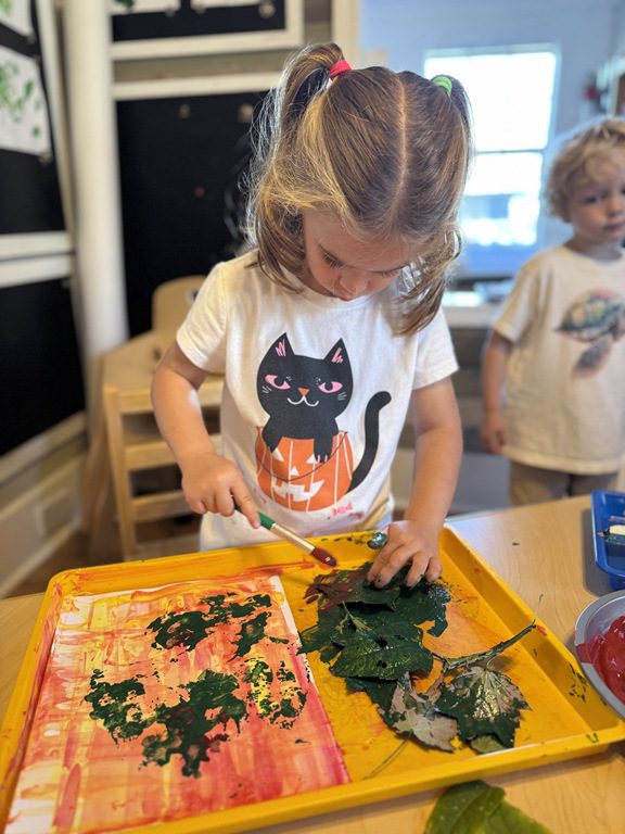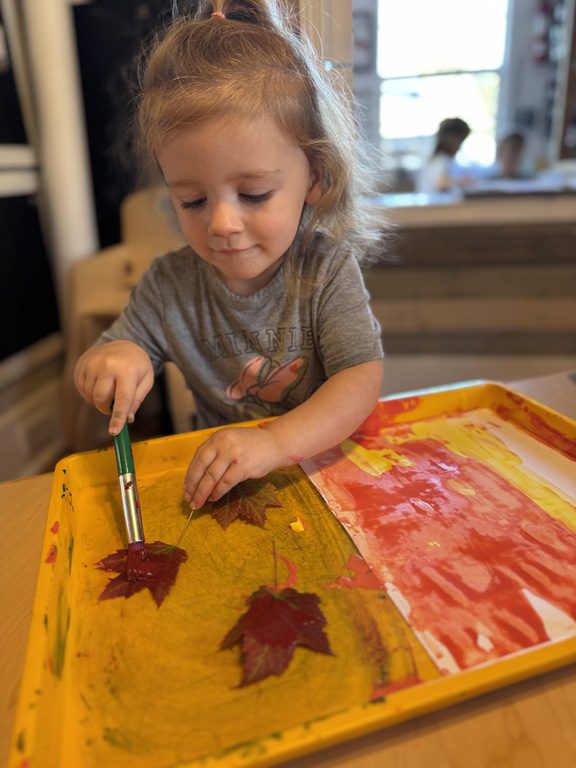 I explained the entire process at the beginning of the project. The kids would see how many steps they could remember. I explained that first, they would make small dots all over their paper using the squeeze bottles. Next, they would use the squeegee to pull the paint across the paper, then they would choose some leaves and paint them, using the tray of red paint and brushes. Lastly, they would print the leaves on the painting. I checked in at each step to see what each child could remember asking, “What is next?”. Of course, younger kids needed some help remembering what to do, but often could remember a couple of steps. There were some of our older friends that could remember every step, and verbalize all of the things they would be doing.