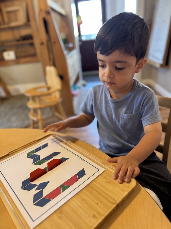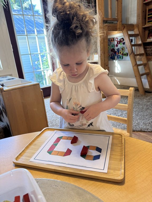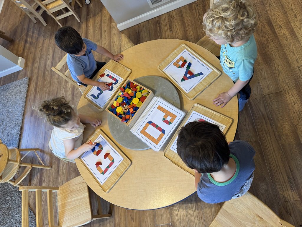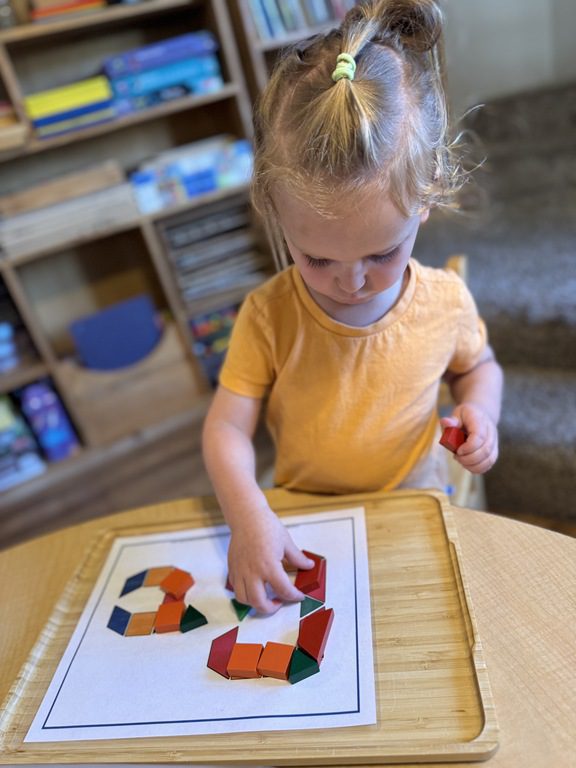 This morning, kids worked on a welcome activity using shapes to create letters.  Friends practiced using small shapes to make larger shapes, matching/identifying shapes and identifying letters.  Many kids chose the first letter of their name to fill in with the pattern blocks.