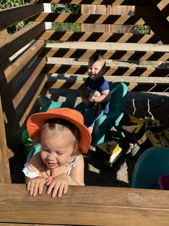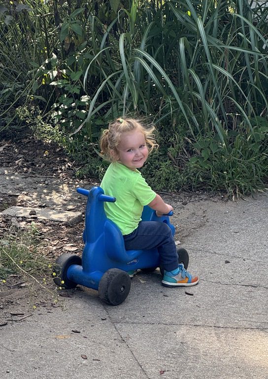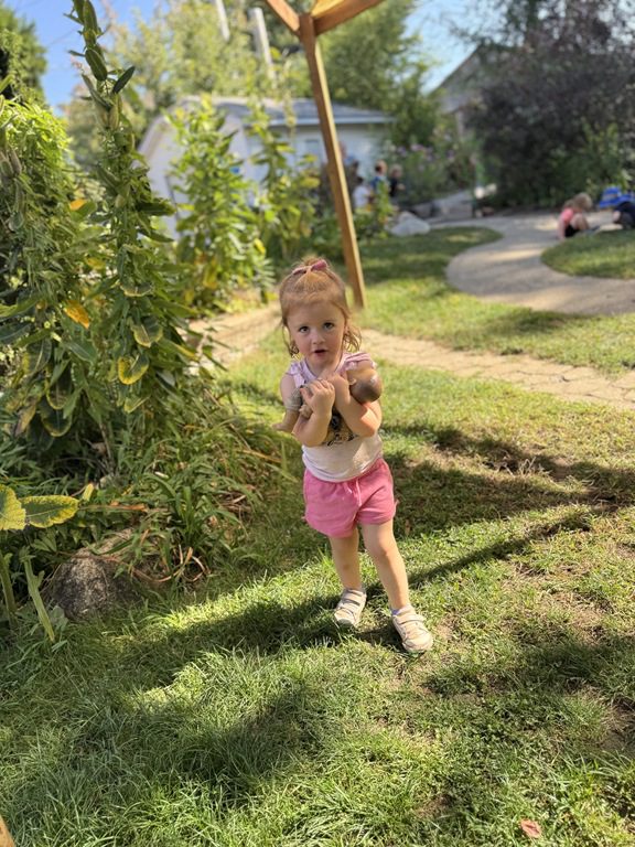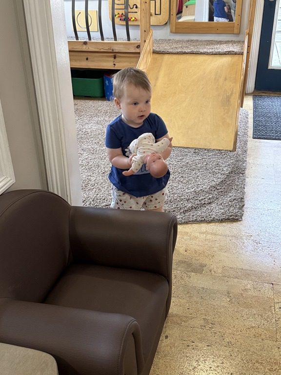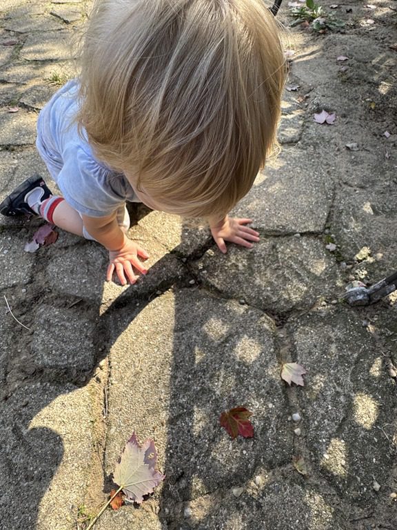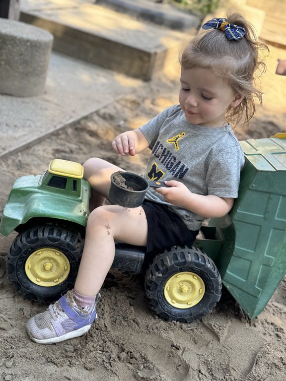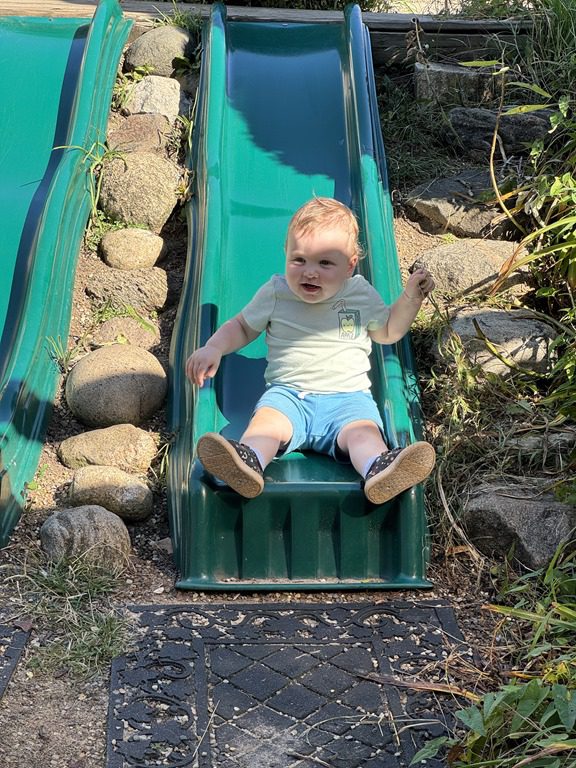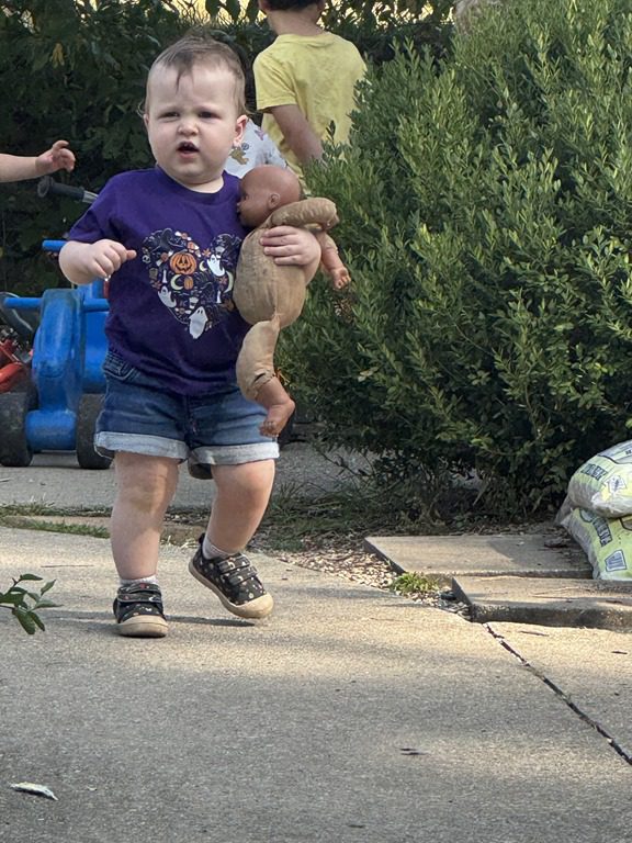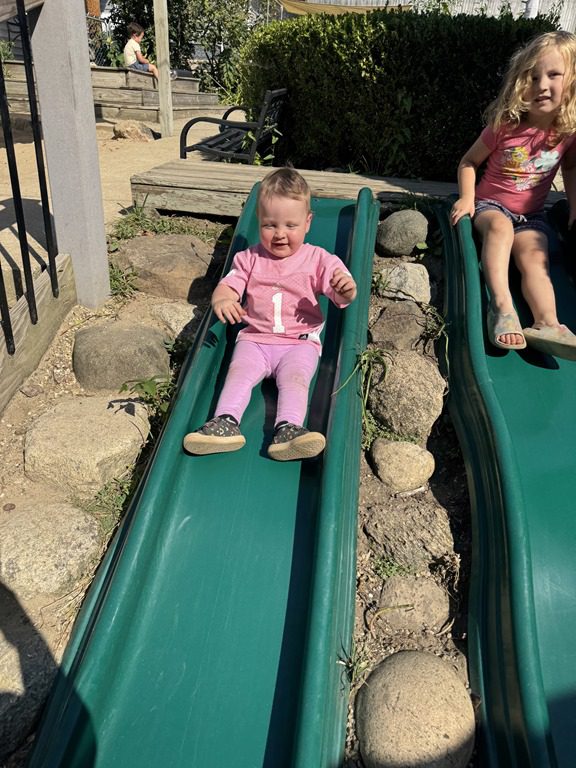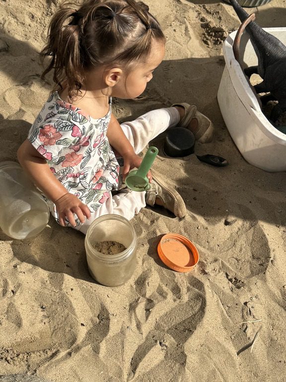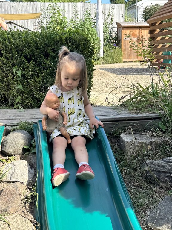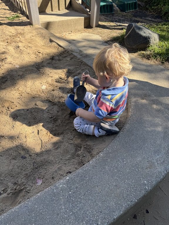 We then headed outside to watch an ant crawl on the cement, scoop in the sandbox, go down the slide and walk with a baby doll.