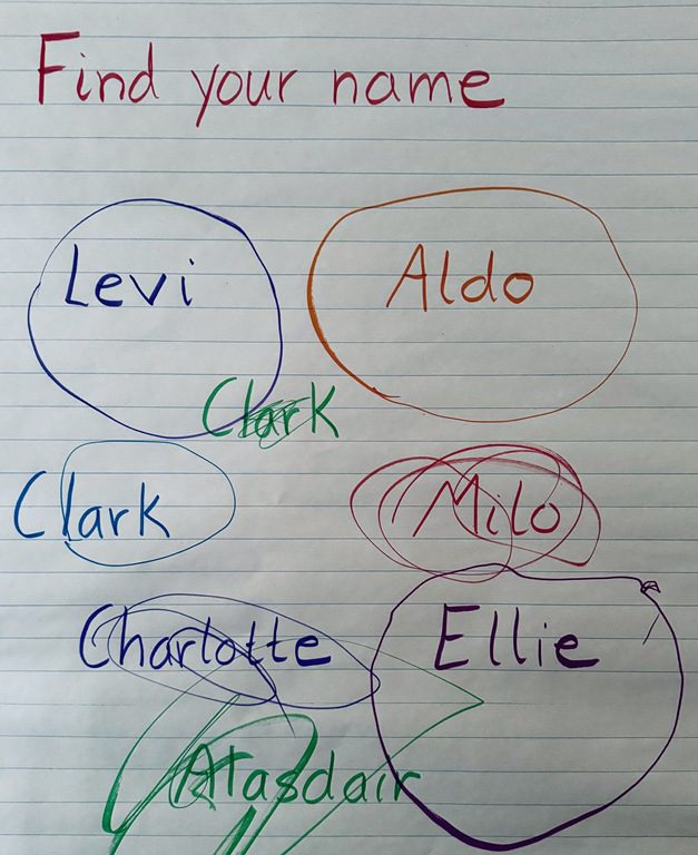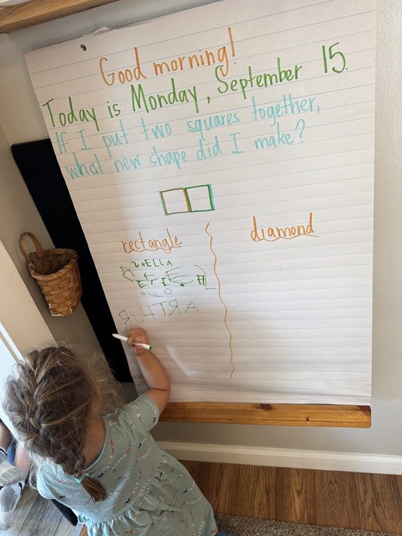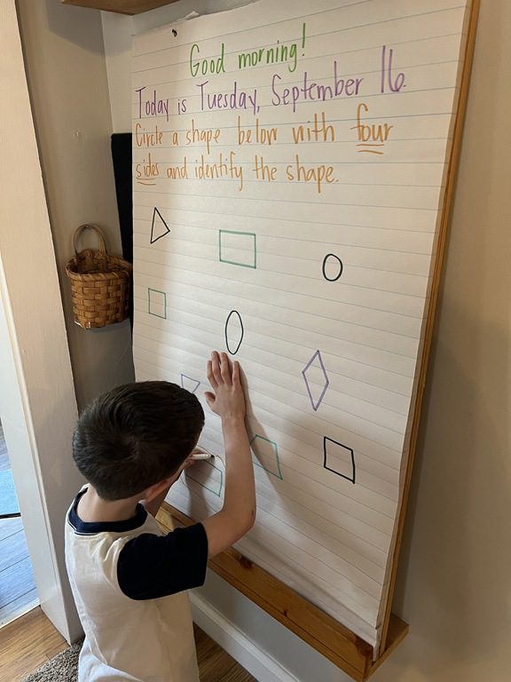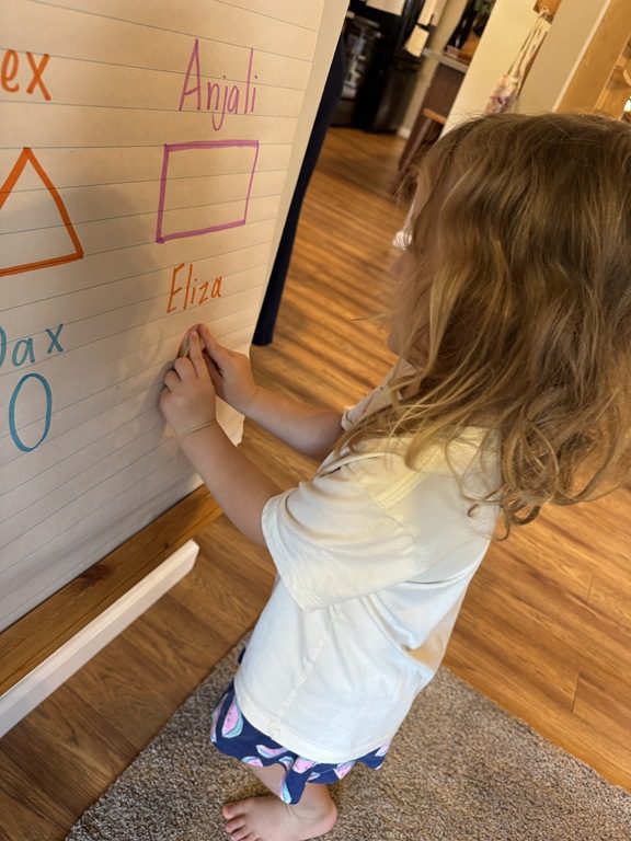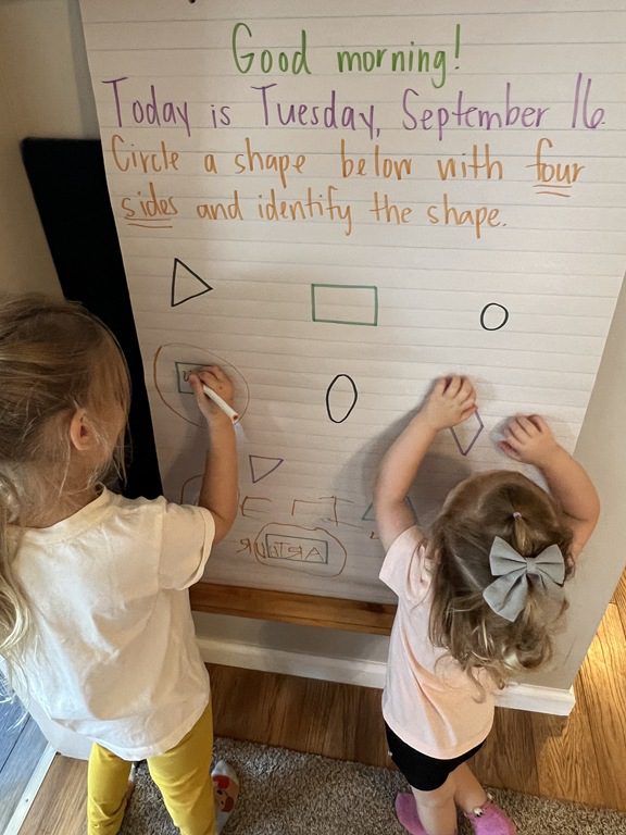Our PREK1 group came to the sign in board where they worked at locating a four sided shape. Once they found a four sided shape, they circled the shape, identified the shape, and wrote their name! There were a few shapes mixed in that had either zero or three sides, sparking up a conversation about how shapes have a specific number of sides.