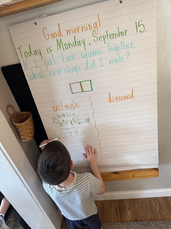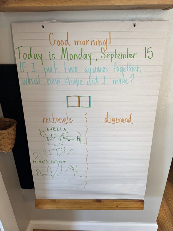 We kicked off our week by talking about how smaller shapes can make larger shapes! Our PREK1 friends came up to the sign in board where they looked at a new shape that was formed by using two squares. Children immediately identified the new shape as a rectangle.