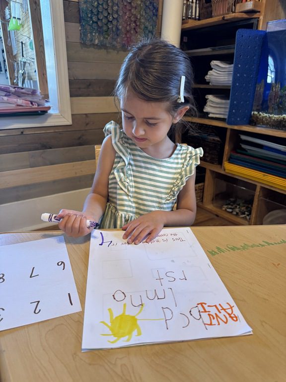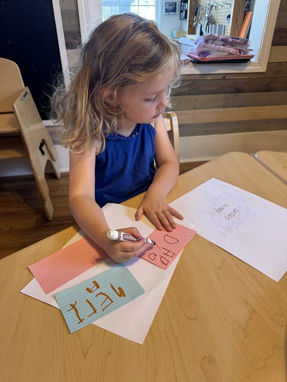 At the art center, writing work continued.  Some kids wrote the names of their family members on cards they chose from the materials box.  Others made books and practiced sounding out stories to write down.  All these little projects allowed for deep child led learning experiences in the area of language and writing.