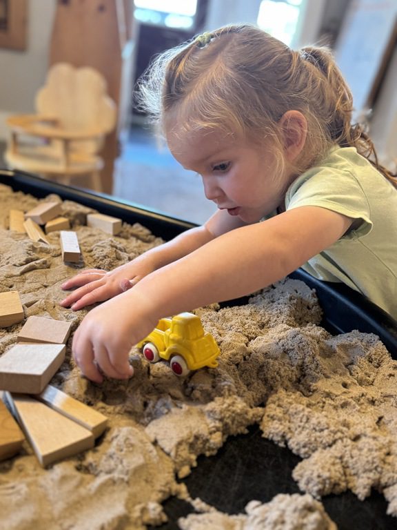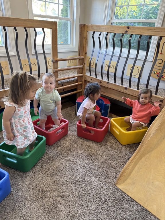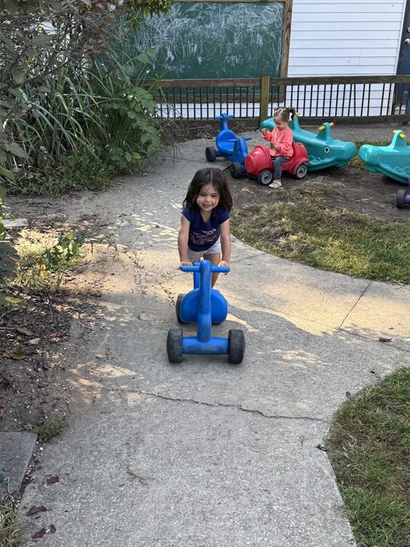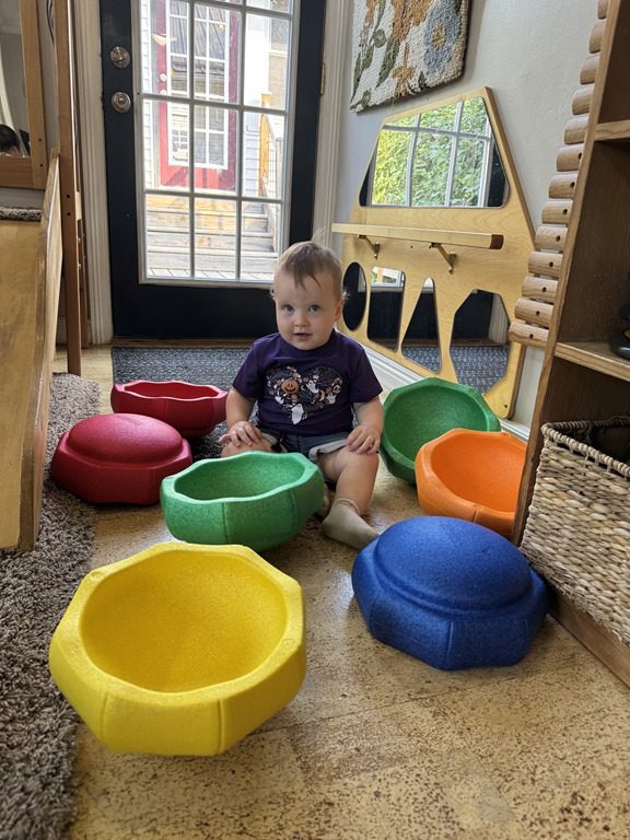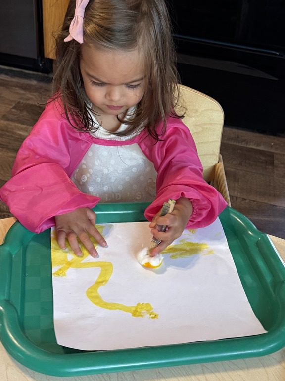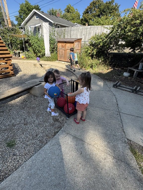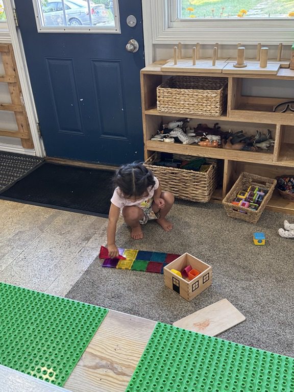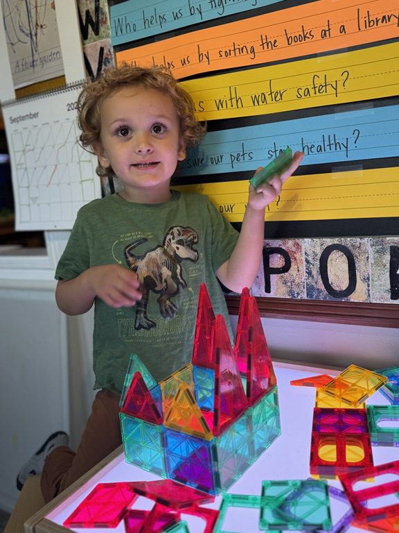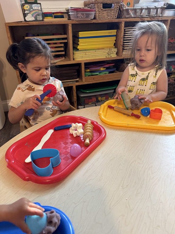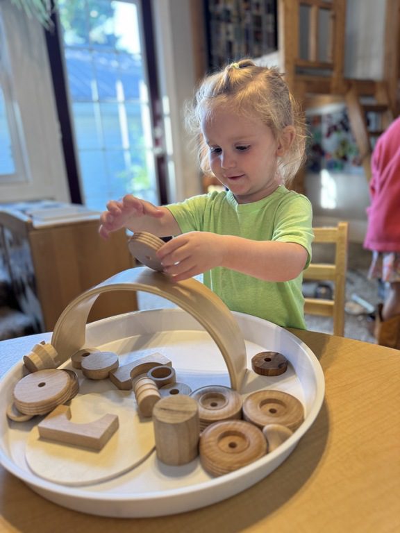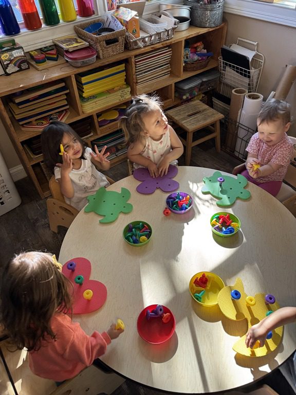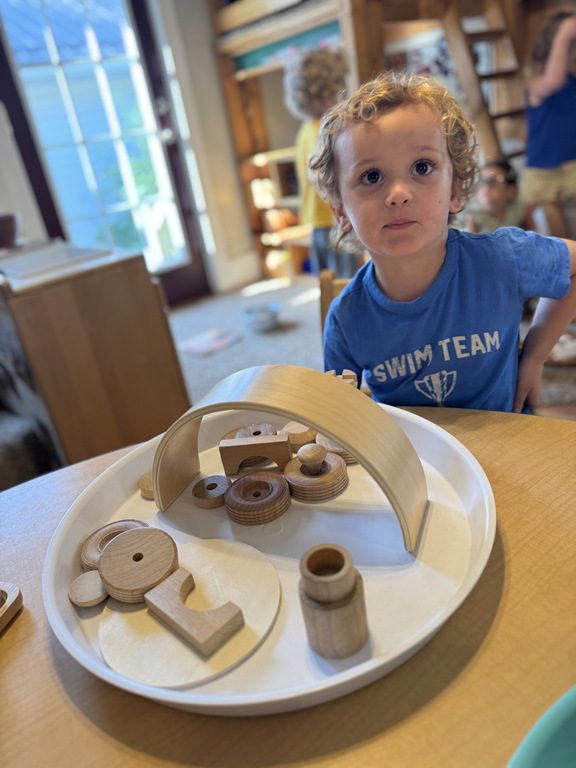 We have been playing with different ways to use shapes as well as putting them together to make new shapes.  Today at our welcome activity, we offered three different shape trays for kids to explore openly.  They made many discoveries through this exploration.  Some friends found that they could use a large half circle from the circle tray to roll the round wooden pieces down.  Others found they could balance the pieces to create tall towers, or as one friends made “pineapple ice cream cones”.  Others found colored pieces on their trays and chose to sort them by color.  It was great to see all the creative ways kids chose to use the shapes.