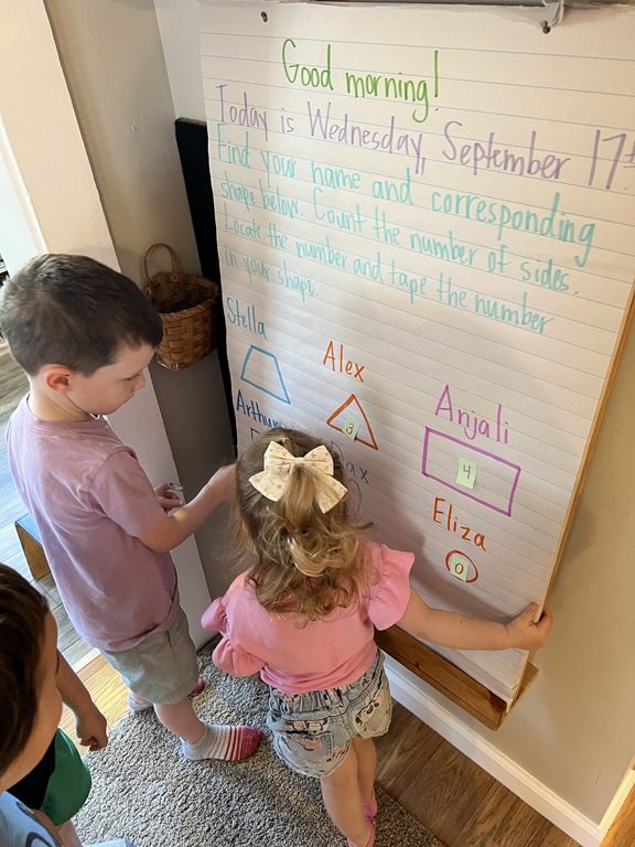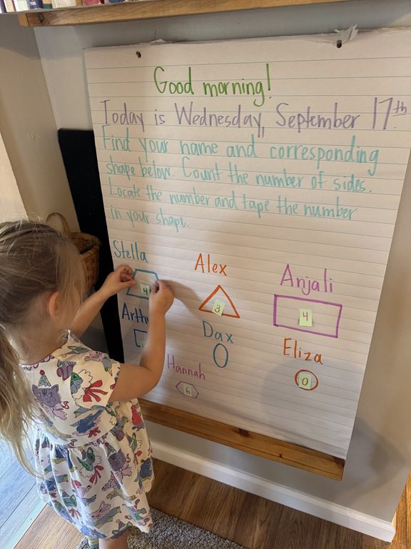 First, children searched the board for their name. They identified the corresponding shape and then counted the sides of their shape. On a plate was a group of different numbers. They searched and found the correct number and taped their number inside of their shape. Eliza was surprised to learn that there were zero sides on a circle.