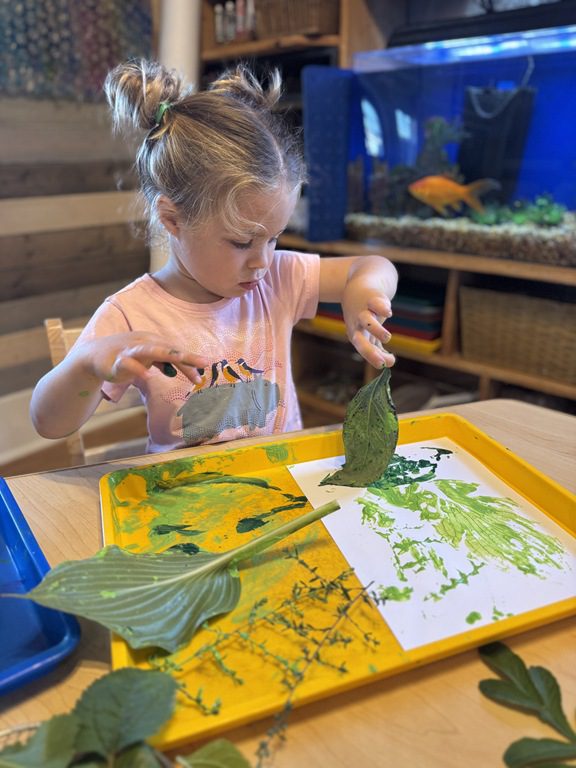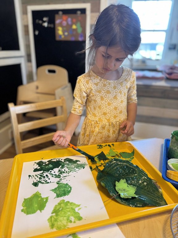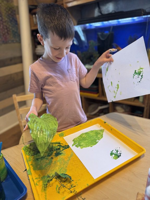 There has been interest in collecting and playing with leaves outside lately, so we thought it would be a great time to do this leaf printing art project.  Kids chose their favorite leaf shapes.  They painted their leaves and then pressed them onto their paper to make prints of the leaves.  Some kids experimented with painting blocks of different shades of green on the same leaf or painting compound leaves in different shades.  This made for some interesting prints!